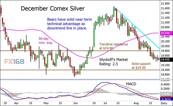 白銀周一(8月25日)紐約時(shí)段盤(pán)初擴(kuò)大跌幅,并刷新19.30美元/盎司日低,整體小跌0.40%。 日線圖上,白銀價(jià)格周一暫收于一根小陰線,隔夜曾錄得小陰十字星,30與60日均線死叉向下。技術(shù)指標(biāo)上看,MACD綠色動(dòng)能柱微幅收縮,雙線零軸下方死叉;隨機(jī)指標(biāo)雙線水平粘合;RSI相對(duì)強(qiáng)弱指數(shù)位于32,逼近超賣(mài)水平。 技術(shù)面來(lái)看,由于銀價(jià)已經(jīng)有效下破19.76美元的61.8%回撤位,暗示中短期下行風(fēng)險(xiǎn)加劇。若后市跌破19.20美元,則將看向19美元整數(shù)關(guān)口。上方強(qiáng)勁阻力自隔夜20美元下移至19.80美元,下方關(guān)鍵支撐位于19美元。 上行方面,若有效突破19.50一線,則看向19.80關(guān)鍵阻力,繼續(xù)上破有望觸及20整數(shù)關(guān)口。下行方面,若有效跌破19.20一線,則看向19整數(shù)關(guān)口,繼續(xù)下破有望觸及5月30日低位18.61一線。 周一每日白銀市場(chǎng)風(fēng)險(xiǎn)指數(shù):2.5。--(每日市場(chǎng)風(fēng)險(xiǎn)指數(shù)是能讓你快速了結(jié)全球市場(chǎng)投資者風(fēng)險(xiǎn)偏好的指標(biāo),從“風(fēng)險(xiǎn)偏好”至“風(fēng)險(xiǎn)規(guī)避”共分為10檔,1為最愿意承擔(dān)風(fēng)險(xiǎn),5為中性,10為最不愿意承擔(dān)風(fēng)險(xiǎn))