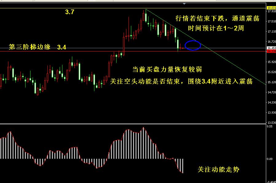 目前紙白銀價(jià)格是3.450元/克。隨著紙白銀回踩第三階梯邊緣3.4~3.42附近后,銀價(jià)下跌動(dòng)能正逐漸減弱,上周五行情雖未出現(xiàn)大幅反彈,但收盤(pán)十字星后,走勢(shì)將有望圍繞3.4~3.42的支撐進(jìn)入震蕩行情。如下圖所示為紙白銀日線走勢(shì)圖,目前銀價(jià)已經(jīng)來(lái)到了我們之前所說(shuō)的兩大支撐3.4和3.15~3.23中的第一道,后市走勢(shì)亦將通過(guò)兩種方式來(lái)調(diào)整:1.時(shí)間換取空間為主的調(diào)整方式,銀價(jià)主要圍繞3.4附近進(jìn)行震蕩,重新積蓄多頭力量,等待再一次拉升,此種情況行情或經(jīng)歷一段震蕩走勢(shì),時(shí)間消耗較長(zhǎng);2.空間為主的方式調(diào)整,銀價(jià)主要通過(guò)繼續(xù)下跌來(lái)釋放空頭力量,同時(shí)在更低支撐位積蓄買(mǎi)盤(pán)動(dòng)能,在跌無(wú)可跌后重啟漲勢(shì)。由于當(dāng)前白銀多頭力量較弱,我們暫時(shí)無(wú)法判斷行情最終進(jìn)行何種方式調(diào)整,建議投資者首先關(guān)注3.4附近的企穩(wěn)情況,根據(jù)此處能否企穩(wěn)判斷銀價(jià)的回調(diào)方式。正如圖中紅線和綠線夾角所示,目前銀價(jià)處于支撐和阻力的收縮三角形內(nèi)運(yùn)行,若行情結(jié)束下跌,未來(lái)走勢(shì)進(jìn)入震蕩的時(shí)間預(yù)計(jì)在1~2周左右,穩(wěn)健者完全可以等待行情企穩(wěn)后再進(jìn)場(chǎng)圍繞3.4上方做多(等待時(shí)間驗(yàn)證)。目前該收縮三角形上方的阻力每日都在下降,直至最終銀價(jià)站上下跌趨勢(shì)線后,行情有望重新開(kāi)始上漲并沖擊3.7~3.82的阻力帶。綜合分析,紙白銀無(wú)論哪種方式調(diào)整,唯一肯定的是,當(dāng)前由于多頭力量暫未完全恢復(fù),銀價(jià)很難立即進(jìn)入拉升。穩(wěn)健者在上述兩種情況發(fā)生前均可保持觀望。若行情以時(shí)間調(diào)整方式為主,則等待其陷入震蕩(在收縮三角形內(nèi)進(jìn)入多日震蕩)后再進(jìn)場(chǎng)亦為時(shí)不晚;若行情以空間方式調(diào)整,則等待其跌破3.4后在3.15~3.23附近重點(diǎn)布局。激進(jìn)者可先利用1~2成倉(cāng)位在3.4上方輕倉(cāng)試盤(pán),切勿頻繁加倉(cāng),等待銀價(jià)企穩(wěn)后再加倉(cāng)剩余倉(cāng)位。今日走勢(shì)預(yù)計(jì)以過(guò)渡為主,建議投資者繼續(xù)保持多看少動(dòng)的思路。(注: 由于紙白銀價(jià)格是國(guó)際銀價(jià)換算而來(lái),而換算過(guò)程中涉及到人民幣對(duì)美元匯率的變化,即使在國(guó)際銀價(jià)不變化的情況下,如果人民幣貶值或升值,也會(huì)導(dǎo)致紙白銀價(jià) 格出現(xiàn)變動(dòng)。因此,我們的分析 只采用最新的國(guó)際銀價(jià)對(duì)應(yīng)的人民幣白銀價(jià)格,如與過(guò)去分析價(jià)格有出入, 投資者應(yīng)知曉其原因。)
