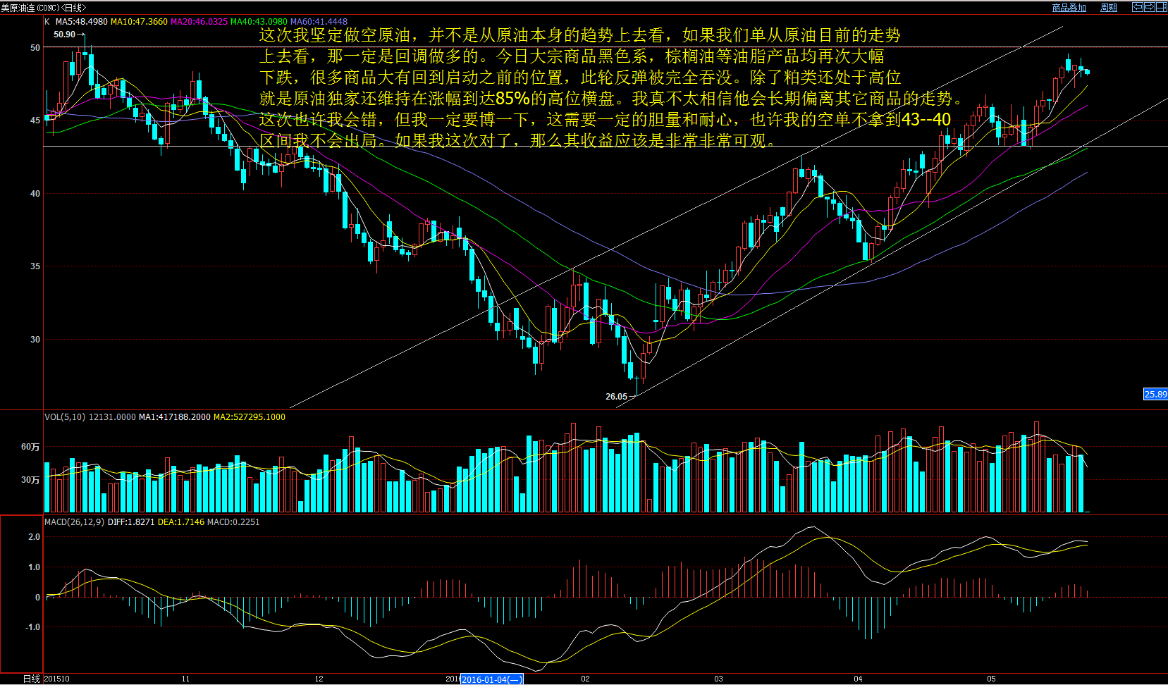 白銀上周五以上影線收盤,多頭力量明顯不足。雖然目前建議投資者在16.4附近介入多單,但該單主要以短線為主。目前從短期趨勢來看,并不是介入中長線多 單的時候,市場哪怕再次走強,都會有一個時間換空間的過程。個人還是認為后期行情維持寬幅震蕩的概率較大,其波動區(qū)間預(yù)計在16~17之間。所以,目前手 中持有多單應(yīng)該在17區(qū)域做獲利了結(jié),如果下跌至16區(qū)域可以繼續(xù)加倉。 對于紙白銀,投資者不要考慮市場會跌倒哪里,在目前的價格區(qū)間只要大跌就就行大買,在資金和時間夠的情況下,最終一定能夠獲利出局。紙白銀不建議做空。 下圖顯示目前銀價還處于下降通道之中,顯然調(diào)整行情還沒有結(jié)束,投資者繼續(xù)等待。近期可能迎來反彈,但反彈預(yù)計難以突破下降通道。 建議輕倉在16~16.4做多,目標17,多看少動。 再 來看看原油走勢,這次堅定在高位做空原油,并不是從原油本身的趨勢上看,如果我們單從原油目前的走勢分析,那一定是回調(diào)做多的。今日大宗商品再次下跌,很 多商品大有回到啟動之前的位置,此輪反彈被完全吞沒。目前原油和粕類處于高位,由于都屬于大宗商品,后期價格應(yīng)該會出現(xiàn)一個回歸。在做好止損的前提下,投 資者可以嘗試博取一個空單,建議目標在40~43美元之間,其收益相對可觀。 建議在48~50繼續(xù)做空原油,目標40~43離場。