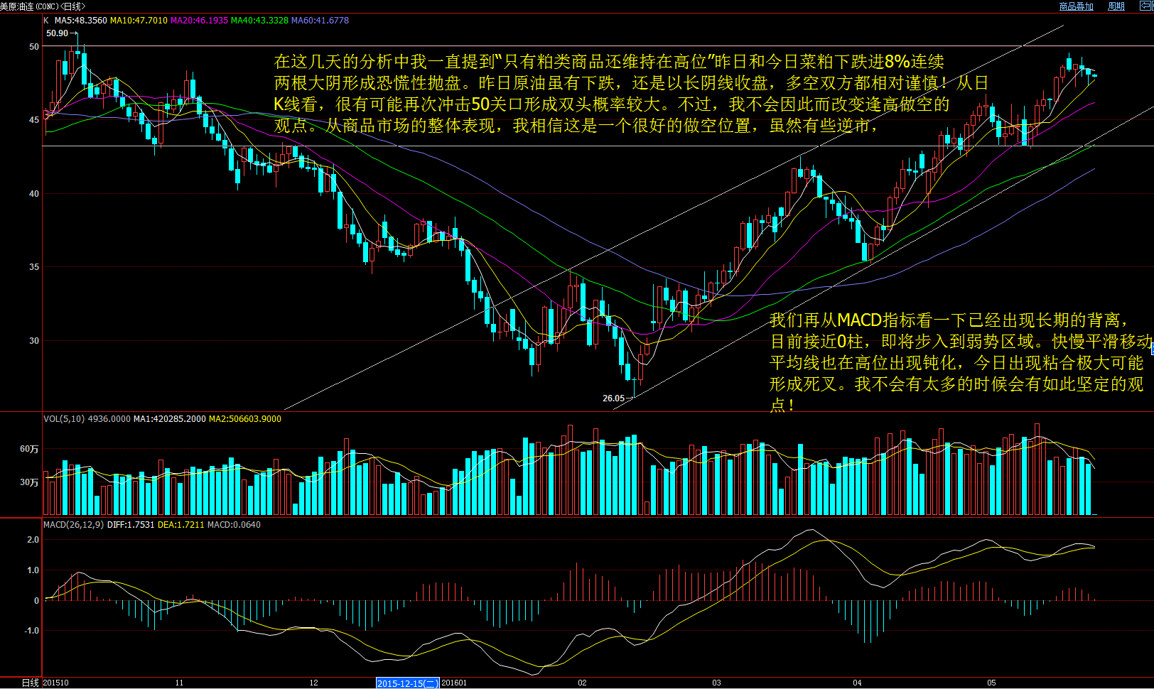 目前白銀價格處于下降通道內運行,途中圓圈標識處為個人主觀意識,后期行情下跌預計不會偏離16美元附近。行情遠離16美元的可能性較低,會有一個底部寬幅震蕩的過程。保守投資者可選擇觀望為主,等待行情進入震蕩后在做多。激進者還是選擇輕倉慢慢介入多單的方式,不過獲利多單企穩值不宜太高,如果再次大跌,可逐步加倉,一定控制好倉位。目前形態來看,白銀還未完全企穩,后市仍需較多時間調整。 策略:逐漸加倉或等待企穩加倉。 再來看看原油走勢,昨日大宗商品在內的菜粕下跌8%,連續大陰線出現恐慌性拋盤。而原油價格昨日雖有下跌,但還是以長陰線收盤,多空雙方相對謹慎。 從原油日K線看,很有可能再次沖擊50關口形成雙頭概率。不過,不建議投資者改變繼續逢高做空原油的思路。從商品市場的整體表現來看,48~50都是一個很好的做空為主,雖然目前逆勢操作,但風險較低,原油回調概率仍然較大。 原油動能指標MACD已經出現長期背離,目前接近0軸附近,即將步入到弱勢區域。快慢平衡移動平均線也在高位出現鈍化,今日出現粘合較大可能出現死叉。因此,技術指標也暗示原油價格見頂調整的可能性增大。 策略:逢高48~50做空原油。