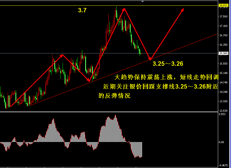 目前紙白銀價格是3.370元/克。昨日紙白銀延續沖高回落,短線走勢并未企穩,投資者可繼續保持多看少動或輕倉高拋低吸的思路,從今日晚間起,市場消息將變得密集且重要,投資者需將注意力轉移至消息面。目前紙白銀技術形態顯示銀價仍未止跌企穩,后市還有繼續調整的需求,根據趨勢線支撐來看,銀價在未來將有較大可能回踩3.25~3.26的趨勢支撐后才能獲得反彈,不過此處能否真正止跌企穩,還需考驗屆時的反彈力度。如下圖所示為紙白銀日線走勢圖,圖中紅線所示為年初至今的上升趨勢線,目前仍然保持良好,隨著近期銀價的回落,行情將逐漸考驗趨勢線支撐。如圖中紅色箭頭所示,當前大趨勢保持了良好的震蕩上行格局,短線走勢雖然處于回落,但等其觸及大趨勢支撐后,不排除短期趨勢跟隨主要趨勢的可能性,建議投資者密切關注銀價回落至3.25~3.26附近后的反彈力度。等待未來走勢企穩后,銀價有望重新開啟新一輪拉升,屆時將再度沖擊中線阻力帶3.7~3.82之間。綜合分析,由于受到消息面利空和技術面拋壓的雙重影響,紙白銀此次調整時間和空間都較大,目前距離企穩尚需時日,投資者不必急于抄底。未來進場建議以先高拋后低吸的思路為主,上方強弱點和阻力集中于3.49~3.52,投資者可嘗試反彈3.4上方輕倉分批高拋,嚴格止損3.52上;下方支撐集中于3.26附近和下方,投資者可嘗試回落至3.26附近后開始輕倉分批低吸。其余點位建議保持觀望。(注: 由于紙白銀價格是國際銀價換算而來,而換算過程中涉及到人民幣對美元匯率的變化,即使在國際銀價不變化的情況下,如果人民幣貶值或升值,也會導致紙白銀價 格出現變動。因此,我們的分析 只采用最新的國際銀價對應的人民幣白銀價格,如與過去分析價格有出入, 投資者應知曉其原因。)