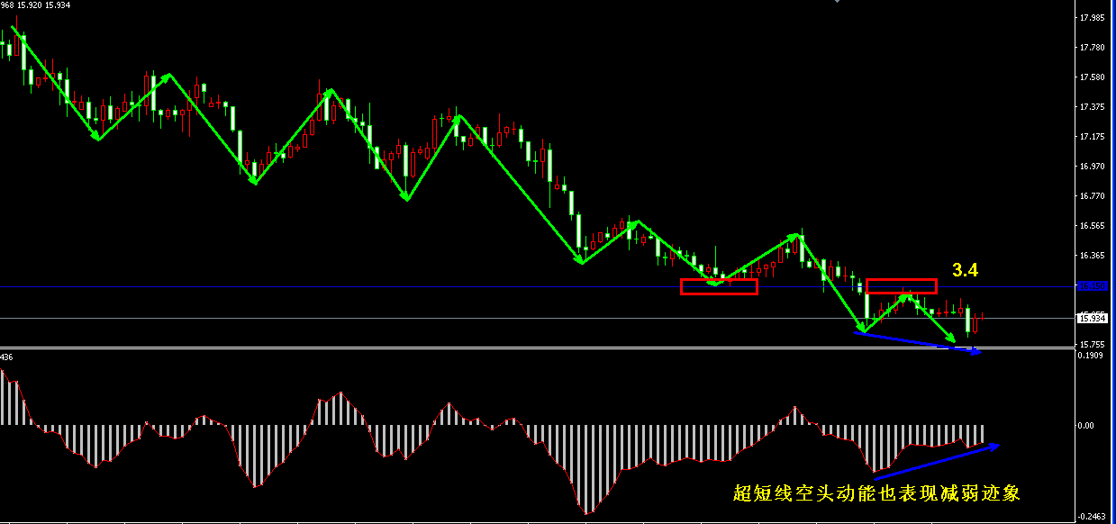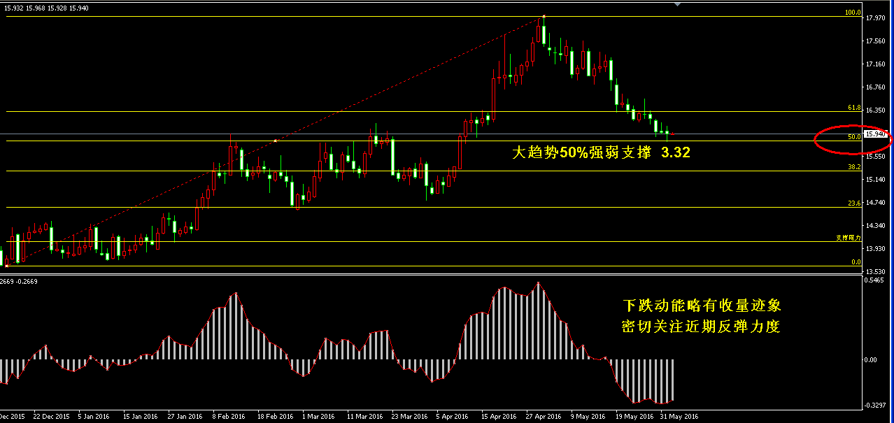 目前紙白銀價(jià)格是3.357元/克。昨日紙白銀繼續(xù)小幅陰跌回落,不過下跌動(dòng)能開始逐漸減弱,近期投資者需關(guān)注銀價(jià)的反彈力度,無論是繼續(xù)回踩支撐還是直接反彈,最終將以反彈幅度和突破信號(hào)點(diǎn)作為判斷企穩(wěn)止跌的參考依據(jù)。如下圖所示為紙白銀日線走勢圖,昨日銀價(jià)回踩了大趨勢的50%強(qiáng)弱支撐位3.32附近形成小幅反彈,雖此處暫無明顯的止跌企穩(wěn)跡象,但日線動(dòng)能指標(biāo)收量暗示下跌動(dòng)能已經(jīng)開始逐漸減弱,后市下方空間正在不斷縮小,建議投資者密切關(guān)注3.32和3.25~3.26兩個(gè)重要支撐位的反彈情況。行情若能圍繞此處形成震蕩,隨著時(shí)間推移,上升趨勢線將有望和該支撐發(fā)生重疊,屆時(shí)買盤力量或?qū)⒋蠓嵘=袢諘阂?.4(第三階梯分水嶺)作為行情反彈幅度的參考點(diǎn),突破此處后銀價(jià)將逐漸走強(qiáng),但并不宣告完全止跌企穩(wěn),投資者在突破3.4后可嘗試圍繞3.32~3.25分批加倉多單。正如我們之前所說,當(dāng)銀價(jià)下跌動(dòng)能減弱時(shí),我們需要關(guān)注的另一個(gè)指標(biāo)便是反彈力度是否恢復(fù),只有當(dāng)兩者條件均滿足的背景下,銀價(jià)才能真正企穩(wěn)止跌;反之,若僅僅下跌動(dòng)能減弱,而買盤動(dòng)能依舊薄弱,此時(shí)行情完全有可能小幅反彈后積蓄空頭壓力繼續(xù)下跌。綜合分析,3.32雖然為大趨勢的50%強(qiáng)弱點(diǎn),但此處我們暫時(shí)僅作重視態(tài)度,尤其關(guān)注今日能否突破3.4前期強(qiáng)壓為主,突破后投資者可適當(dāng)放寬倉位,激進(jìn)者圍繞3.32附近輕倉分批加倉,后市銀價(jià)或先轉(zhuǎn)入震蕩,等其進(jìn)入震蕩走勢后,我們再通過判斷震蕩行情的高點(diǎn)來確認(rèn)真正的止跌企穩(wěn)信號(hào)點(diǎn)。(注: 由于紙白銀價(jià)格是國際銀價(jià)換算而來,而換算過程中涉及到人民幣對(duì)美元匯率的變化,即使在國際銀價(jià)不變化的情況下,如果人民幣貶值或升值,也會(huì)導(dǎo)致紙白銀價(jià) 格出現(xiàn)變動(dòng)。因此,我們的分析 只采用最新的國際銀價(jià)對(duì)應(yīng)的人民幣白銀價(jià)格,如與過去分析價(jià)格有出入, 投資者應(yīng)知曉其原因。)