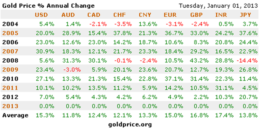 2012年雖然不像之前大多數分析師和華爾街大佬們預計的那樣是個黃金大牛年,但是以所有主流貨幣計價的黃金價格在這期間都有所上漲。 又到了辭舊迎新的關口,像去年這時候一樣,依然有眾多分析師或投行看漲新一年的黃金市場,也許未來幾年內,黃金不會像2005-2007年那樣讓你的財富成倍翻漲,但至少從過去近十年的數據來看,黃金并沒有愧對“避險天堂”的稱號。 下圖為2004年以來,以所有主流貨幣計價的黃金價格每年的漲跌情況。 以美元計價的黃金價格在過去9年中的年均漲幅為15.3%: 如果你在2004年用印度盧比買入黃金,并且至今未拋售,那么祝賀你,2004年至2012年間,你的黃金投資每年平均收益率高達17.4%。 即使是市場普遍認為黃金表現(xiàn)不夠強勁的2012年,如果你是用日元投資的,也能收獲高達20.7%的利潤。