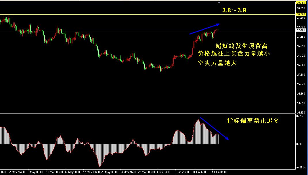 目前紙白銀價格是3.673元/克。昨日紙白銀下跌后又快速反彈,一方面顯示了目前市場仍處于上漲趨勢之中,另一方面也說明,隨著銀價逐漸反彈,上方的空頭壓力正越來越強。如下圖所示為紙白銀4小時周期走勢圖,近期銀價上漲力度已經明顯縮小,正如圖中藍色箭頭所示,價格屢創新高,而買盤動能卻未能創出新高,暗示銀價超短線已經發生頂背離。目前行情越往上波動,則買盤力量越小,隨著阻力帶的臨近,行情越往上運行,空頭動能越強,這種多空力量的逐漸變化,最終有一日將演變為質變。日內投資者僅可持有多單保持觀望,在指標偏離的背景下禁止追多,保守者在3.68上方便可開始分批減倉多單,直至阻力帶3.8~3.9開始大幅度減倉。日內投資者還需關注昨日回落低點3.6附近,該點位可視作為近期回調中多頭力量集中買盤區域,昨日銀價回落至此便出現反彈,若近期行情跌破此處,則暗示多空力量恐發生變化,屆時不排除銀價將繼續向下調整的可能性,此種情況應擇機反彈減倉多單。綜合分析,雖然紙白銀上升動能正逐漸減弱,但如果遲遲沒有空頭打壓,則銀價將保持近期的緩慢上行格局,所以操作上是絕對不可以去盲目做空的。另外,一旦空頭集中出現,以目前的買盤力量實在難以抵住行情回落的風險,所以操作上也是絕對不可以追多的。我們暫時可以將昨日回落低點3.6視作為多空力量發生轉變的一個信號點,跌破此處,則未來24~48小時行情繼續回調的概率增大;反之,近期銀價或維持緩慢上行格局直至美聯儲決議公布。目前點位正處于高點,最佳策略便是將前期多單分批減倉獲利,等待市場技術面指引方向和消息面塵埃落定后重新安排策略進場。(注: 由于紙白銀價格是國際銀價換算而來,而換算過程中涉及到人民幣對美元匯率的變化,即使在國際銀價不變化的情況下,如果人民幣貶值或升值,也會導致紙白銀價 格出現變動。因此,我們的分析只采用最新的國際銀價對應的人民幣白銀價格,如與過去分析價格有出入, 投資者應知曉其原因。)