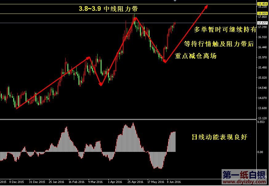 基本面方面:本周最大的消息塵埃落定,其結果無疑以利多為主。今日凌晨美聯儲公布利率決議表示,宣布維持聯邦基金利率目標區間在0.25-0.5%,美聯儲此次政策決定是委員一致投票通過的,聯儲官員較之前決議更加偏向寬松態度。另外,美聯儲在聲明中下調今明兩年經濟成長預估,強調目前的經濟形勢只適合漸進加息。雖然耶倫隨后發表的講話依然保持了7月加息的可能,但稱將完全依賴于后市經濟復蘇狀況而定,這顯得十分勉強投資者目前并不看好未來美國經濟情況。同時,美聯儲主席耶倫也發表了關于英國退歐而產生的擔憂,由此增加市場避險情緒抬升。今日投資者可重點關注晚間20.30公布的美國5月消費者物價指數,該數據在一定程度上反應美國經濟狀況,將左右市場對于7月美聯儲加息預期的影響。 技術僅僅是基于概率論和統計學的一種綜合分析手段,絕非預測。所以技術分析是在考慮做好止損的情況下去博取大概率事件,投資不可過于迷信技術分析。(短線操作請一定做好止損,一旦被損,代表分析師基于概率和統計的技術分析不適用于當前行情) 1、紙白銀短線看點位,中線做方向。 2、以上所有價格為工商銀行買入價,即紙白銀低價。進倉點位要再加0.04,出倉則不要。 3、第一紙白銀給出的所有建議僅供投資者參考,不作為下單絕對依據,切勿過于依賴。 4、北京時間08:55發布此文章。 5、上一交易日白銀價格分析情況:(6月15日)紙白銀面臨方向選擇 等待美聯儲決議指引
