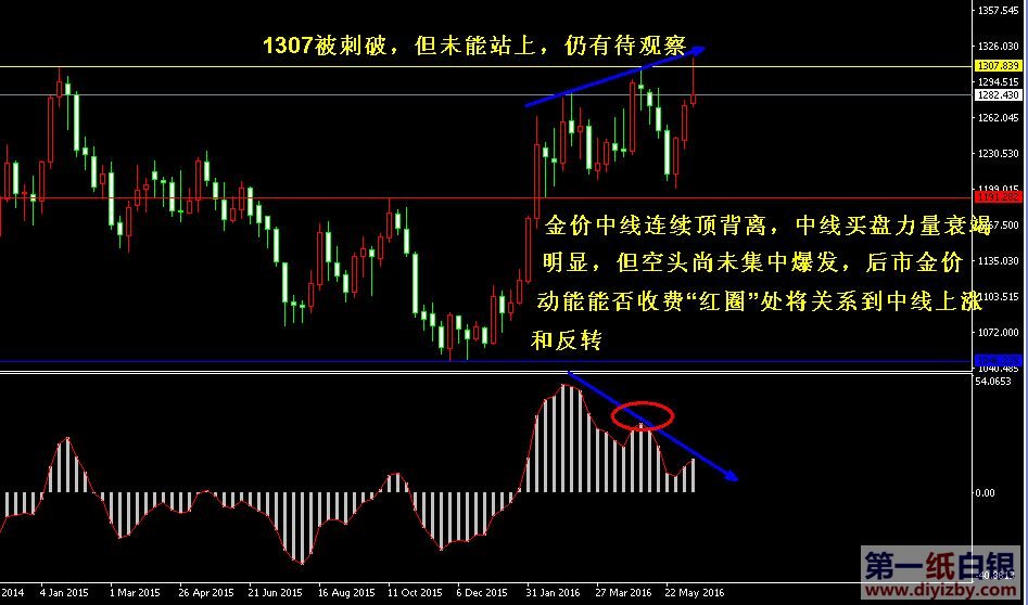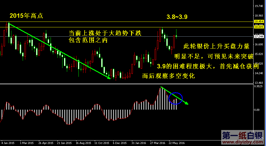 目前紙白銀價格是3.641元/克。昨日紙白銀上演過山車行情,先是因美聯儲利率決議利多而緩慢上行,而后受到英國退歐暫停拉票而出現大幅回落,市場目前正聚焦英國退歐公投以增加避險情緒,若公投失敗或結束,則金銀高位勢必增加較大的空頭壓力。技術層面顯示銀價在靠近阻力帶3.8~3.9后賣盤力量逐漸增強,投資者減倉仍為主要選擇手段,在銀價未突破3.9或未見頂反轉之前,暫時放棄下一輪布局策略,等待信號指引后操作較為穩健。昨日行情雖大幅回落,但目前仍暫無信號證明此次調整已經開始,因此投資者目前還不可盲目做空,日內思路繼續以反彈減倉為主。受到昨日大幅下跌的影響,今日減倉點位可逐漸降低,重倉者應在反彈過程中分批減倉,著重在3.7上方獲利離場,輕倉者繼續等待銀價反彈至3.8~3.9減倉所有多單。如下圖所示為紙白銀周線走勢圖,目前行情上漲或下跌完全依賴于周線形態的支撐和壓制,此次銀價在靠近阻力帶3.8~3.9附近回落也是銀價中線買盤動能不足的表現。圖中藍色圈顯示銀價雖然再度沖擊3.8~3.9,但其多頭力量已經較之前明顯減弱,前一次在多頭力量較為充足的背景下,銀價尚未突破3.8~3.9,此次買盤動能相對前次疲軟,其后市突破3.9分水嶺的難度將增大。這也是我們建議投資者首先減倉獲利的原因,至于后市行情是反轉下跌還是震蕩后繼續上行,需考量市場空頭力量是否爆發而決定。仍然如前期所言,在一個多頭動能衰竭的行情中,若遲遲未見到空頭爆發信號,則銀價并不會因買盤減弱而出現反轉或回調,僅僅震蕩或小幅調整后繼續拉升;反之,只有當“多頭衰竭,空頭復蘇”同時滿足時,銀價才具備回調和反轉的可能。目前走勢多頭衰竭表現在中線形態,而短線和日線均未出現此跡象,同時空頭爆發并不徹底,還有待觀察。據此,我們僅建議近期以減倉獲利多單為主,不追多,也不可提前做空。綜合分析,當前上漲行情正處于2015年大下跌趨勢的包含范圍之內,前次多次說明,只有突破3.9分水嶺,中長線下半年才能打開空間。昨日的回落充分證明了上方阻力帶附近的空頭壓制,投資者不可小覷。目前市場是回調后空中加油,還是真正的回落信號,仍有待觀察。昨日的沖高回落尚未給予市場明確的做空信號,日內行情反彈依舊以減倉為主,暫時不提前布局空單,也不可再過分追多。(注: 由于紙白銀價格是國際銀價換算而來,而換算過程中涉及到人民幣對美元匯率的變化,即使在國際銀價不變化的情況下,如果人民幣貶值或升值,也會導致紙白銀價 格出現變動。因此,我們的分析只采用最新的國際銀價對應的人民幣白銀價格,如與過去分析價格有出入, 投資者應知曉其原因。)