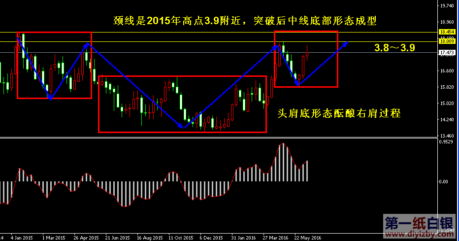 目前紙白銀價格是3.679元/克。本周紙白銀整體走勢維持高位震蕩,受到美聯儲利率決議不加息、耶倫講話偏向鴿派、英國退歐公投在即的三大利多影響,周內銀價維持上行格局,雖然周四晚間行情因英國退歐公投問題出現沖高回落,但目前市場并未釋放充足的空頭動能以驗證銀價啟動回調,此次回落暫時只能定性為投資者避險情緒減弱的一次高位獲利了結。目前銀價仍然有較大可能繼續沖擊3.8~3.9的中線阻力帶,后市投資者將重點關注3.9能否突破,若突破該點位,則下半年行情將向上打開極大的空間,并完成中線頭肩底形態,未來幾年持續震蕩上行行情可期;反之,若不能突破3.9,則銀價下半年將繼續在大區間內震蕩,以構筑右肩形態為主。如下圖所示為紙白銀周線走勢圖,該周期指示了銀價的中長期走勢格局,目前銀價正在3.9下方構筑頭肩底形態,其中3.9為2015年1月高點,也是今年至今上漲所處的大下跌趨勢的最高點。圖中紅色框分別顯示了左肩、頭部、右肩形態,但目前右肩尚未完全成型,后市投資者將關注其能否順勢突破3.9頸線高點,突破此處后,整個頭肩底形態將完成,中長線底部經歷近2年時間將形成,未來幾年行情偏向樂觀反彈;若近期銀價遲遲無法突破3.9,則銀價極有可能繼續維持高位整理,類似左肩一樣,因此行情偏向于震蕩,此時以高拋低吸為主,逢低做多為輔即可,直至突破3.9后順勢加倉。綜合分析,從紙白銀大周期形態我們可以得出,當下走勢回落布局多單是較為安全的,即使未來銀價沖擊3.9遇阻,做空仍然是短線操作,等待其回落至3.5下方后都不可再高拋做空,而因采取徐徐分批加倉多單的方式進場。由于目前銀價尚未進入高位震蕩階段,暫時不給出高拋低吸的點位,投資者下周可繼續觀察3.9的突破情況以及此處是否形成見頂形態。在右肩是突破還是繼續構造不確定之前,我們保持觀望即可,前期多單高位減倉獲利,新的信號出現后重新布局。以上建議僅供參考, 不作為下單依據。
