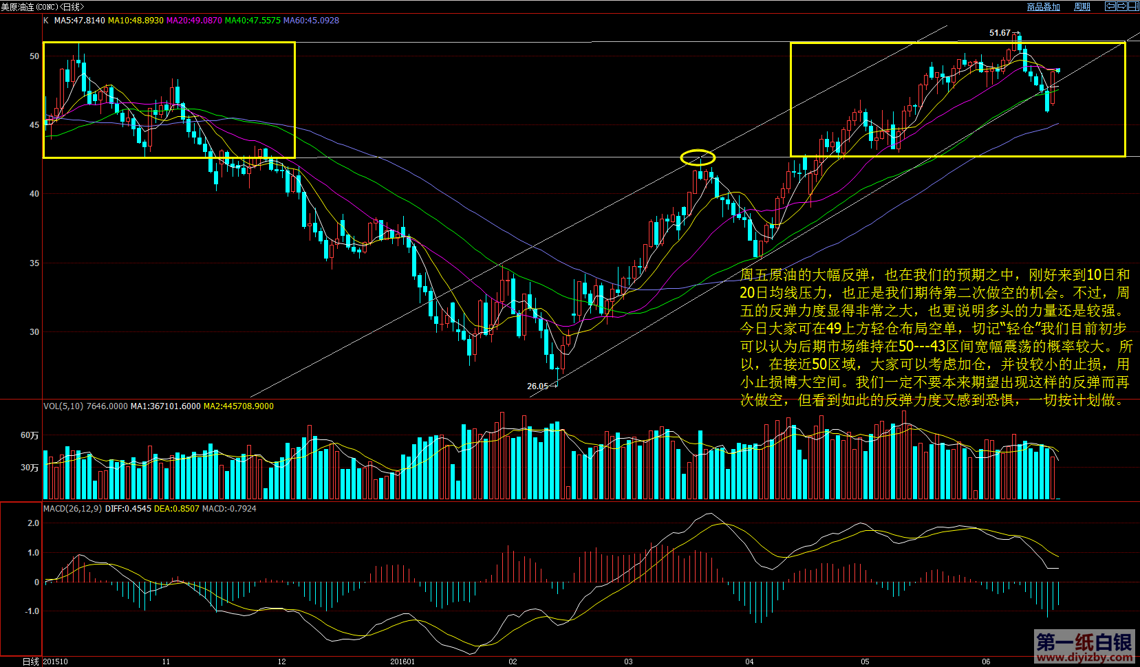 白銀價格上周四在經歷了5%的振幅后,周五出現強勁反彈,這也說明一個觀點:行駛的列車不會瞬間停止,多頭力量也不可能瞬間消失,多空雙方后期預計在 17.5~17.2的小區間進行短時間的博弈。穩健投資者可選擇等待多頭力量確認衰竭后介入空單,激進者完全可以選擇高位做空,控制好倉位,目前不建議投 資者追多。 原油策略:反彈49~50分批做空。