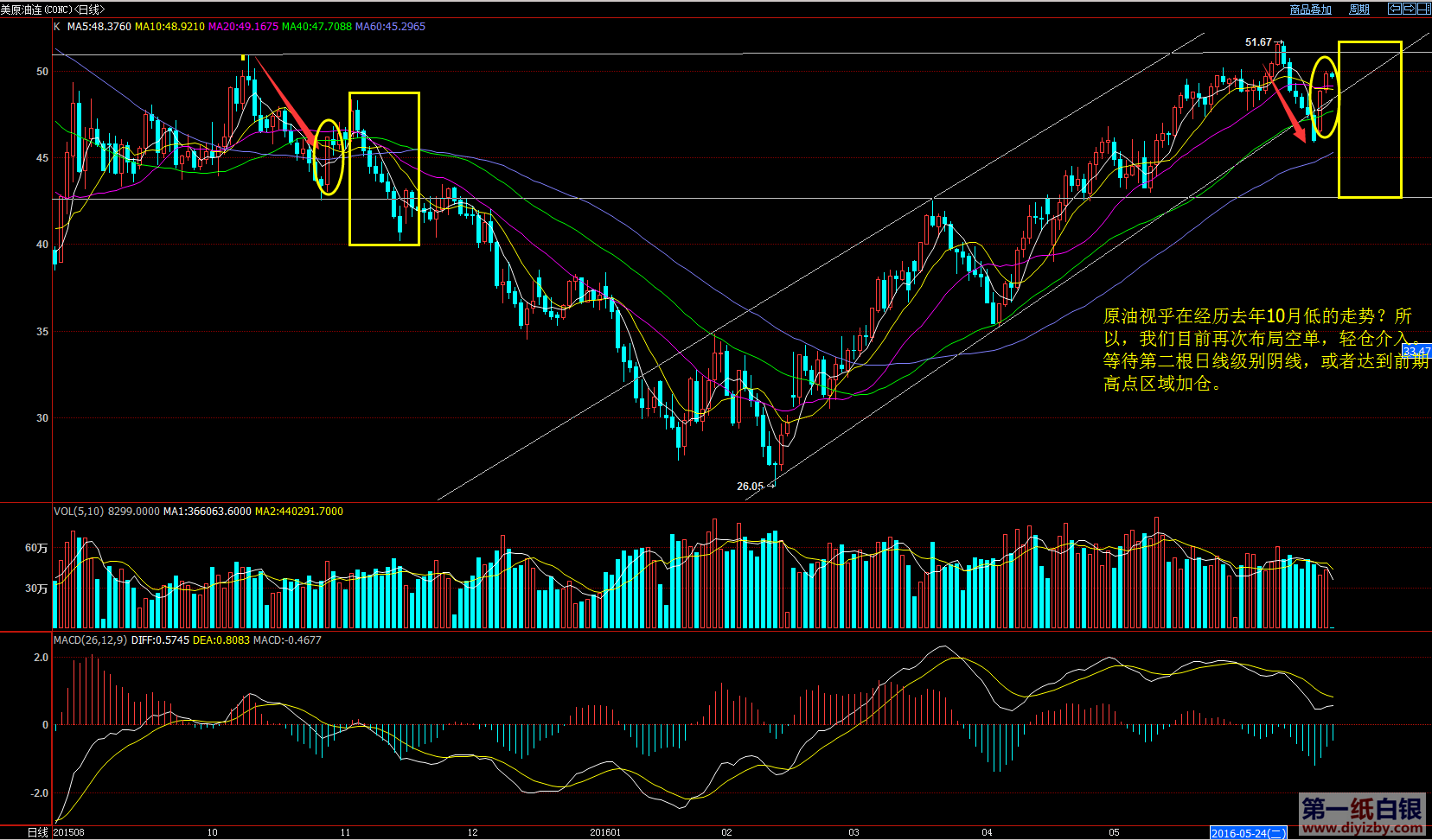 昨日白銀價格維持寬幅震蕩,多空爭奪較為激烈,最終行情以十字星收盤。上周五英國退歐公投的風險事件令投資者保持謹慎,近期行情波幅應該不會太大。目前市場正等待周四周五最終公投結果,不過在此之前仍可以嘗試布局。目前本人建議繼續維持高位做空的思路。白銀以18美元作為止損點即可,突破則止損,否則仍具有較大利潤空間。 關于消息面的英國退歐事件,也是炒作了好幾年的事情,但我仍然相信這只是一個噱頭,最終英國不會退出歐盟。任何國家都不可能希望自己國家經濟陷入困境,如果英國退出歐盟,短期內英鎊下跌對英國經濟是很大的打壓。所以,至少目前退歐只是一種猜測,投資者可完全忽略。再者,加入一定會極端的影響市場,我建議投資者選擇帶好止損做空,因為從技術層面來看,上漲比下跌的空間小很多。不過,保守投資者最好還是等待10日均線和20日均線再做空安全很多。 日內白銀策略,反彈17.5上方做空,止損18上方,目標17及17下方。 再來看看原油走勢,原油價格近期似乎在經歷去年10月底的相同走勢,所以,我們目前再次布局空單,輕倉介入等待第二次回落出現。正如圖中黃框所示,后市反彈過程中圍繞48~50做空即可,止損51.67高點上方。