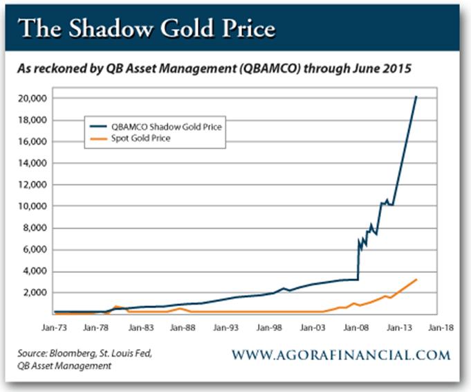 QB還給出了關于影子金價(SGP)的圖表,用了布雷頓森林體系(Bretton Woods)的計算方法,計算美元兌黃金的匯率,假設美聯儲每月印美元850億,那么到2015年6月,這個影子金價價格會高得難以想象:每盎司20000美元。 如果影子金價和實際金價的比率不變,那么到2015年,金價將會飆漲到每盎司3400美元,高質量金礦股票也會上漲幾百倍。