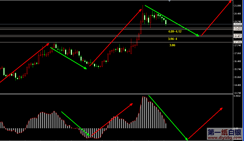 目前紙白銀價格是4.175元/克。昨日紙白銀延續下跌,且跌幅開始擴大。正如我們之前所說,隨著動能指標MACD逐漸向零軸附近靠攏,市場空頭力量也將越來越大,此時行情將由震蕩調整緩慢向震蕩下跌調整過渡,最終當空頭動能徹底完成釋放后,銀價重新在低位積蓄買盤力量,如此才能完成一輪修復,并為下一次行情拉升做足充分準備。從目前紙白銀形態和指標來看,銀價近兩日繼續修復回落的可能性依舊較大,投資者可重點關注4.2下方支撐,當行情回落至4.2下方后,走勢將面臨較多的支撐位,此時也是我們所說的密集支撐帶,如果以大趨勢看漲為主要方向,投資者可在支撐位附近重點布局多單,以期待未來獲取更大的盈利空間。如下圖所示為紙白銀日線走勢圖,圖中紅綠箭頭交替運行,正是當前銀價所處的震蕩上行格局。目前走勢正處于綠色箭頭所示的回調行情之中,隨著動能指標向著零軸下方放量,銀價未來雖有望繼續下行,但下跌幅度預計不會太大。正如圖中白線所示,跌破4.2后,行情便開始面臨較多的主趨勢支撐位,其中4.09~4.12、3.96~4、3.86幾線均是大趨勢強支撐,未來銀價亦有望在上述點位完成止跌企穩,建議投資者密切關注支撐位的同時,采取分批3分的方式加倉多單。綜合分析,此時的紙白銀雖處于回調行情之中,但該回調卻屬于次級調整趨勢,而主趨勢仍然為上漲走勢。當次級調整趨勢遭遇主趨勢支撐后,銀價有望順應主趨勢重新開始新一輪拉升。此輪行情調整完畢后,由于整體走勢依舊看漲,未來行情將有望獲取更大的拉升空間。如果以短線空頭回落的蠅頭小利來看,中線上漲將是具備豐厚利潤的可能性。基于此,我們建議投資者放棄此輪回落做空,以回落分批加倉多單為主。(注: 由于紙白銀價格是國際銀價換算而來,而換算過程中涉及到人民幣對美元匯率的變化,即使在國際銀價不變化的情況下,如果人民幣貶值或升值,也會導致紙白銀價 格出現變動。因此,我們的分析只采用最新的國際銀價對應的人民幣白銀價格,如與過去分析價格有出入, 投資者應知曉其原因。)