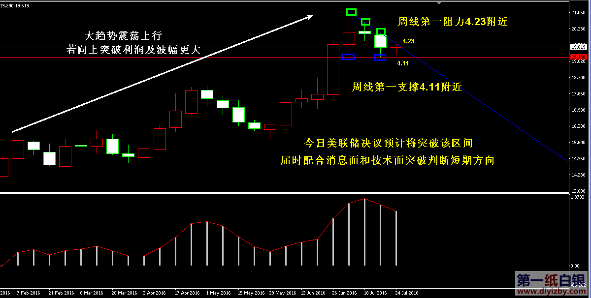 目前紙白銀價(jià)格是4.196元/克。昨日紙白銀小幅收陽,但整體走勢仍維持窄幅波動,市場在美聯(lián)儲利率決議公布之前正保持謹(jǐn)慎的觀望態(tài)勢。明日凌晨2點(diǎn)美聯(lián)儲將公布7月最新利率決議,此次決議普遍預(yù)期加息概率較低,若美聯(lián)儲同時(shí)釋放鴿派言論,將有望助長銀價(jià)完成止跌企穩(wěn),并開啟新一輪漲勢。如下圖所示為紙白銀周線走勢圖,明日凌晨公布決議后,我們需以周線的第一支撐和第一阻力作為銀價(jià)技術(shù)面突破參考依據(jù),同時(shí)配合消息面利多或利空,可極大的確認(rèn)短期銀價(jià)波動方向的準(zhǔn)確性。圖中紅線所示為近幾周行情回踩低點(diǎn)形成的雙底4.11,也是周內(nèi)所面臨的第一道強(qiáng)力支撐,在沒有外力刺激下,銀價(jià)預(yù)計(jì)難以跌破該點(diǎn)位,此處可視為短期多頭聚集處;藍(lán)線所示為近幾周回落行情高點(diǎn)連線,該趨勢線同樣對本周初的走勢產(chǎn)生了壓制,壓制點(diǎn)位在4.23附近,在沒有外界刺激的情況下,以當(dāng)前市場多頭力量預(yù)計(jì)難以突破該阻力,此處亦可視為短期空頭聚集處。由此我們推算,當(dāng)明日凌晨美聯(lián)儲利率決議公布后,銀價(jià)若配合消息面實(shí)現(xiàn)區(qū)間4.11~4.23的突破,將極大的幫助投資者判斷方向,屆時(shí)超短線操作便可順勢而為,但做多仍為主思路,即使利空下跌,做空僅為短線輕倉單,切勿大幅或盲目加倉。綜合分析,今日晚間(明日凌晨2點(diǎn))美聯(lián)儲決議公布后,銀價(jià)預(yù)計(jì)突破區(qū)間4.11~4.23的概率極大,屆時(shí)配合消息面和技術(shù)面突破確認(rèn)短期波動方向。由于大趨勢仍然處于上漲格局,若銀價(jià)向上突破4.23,則利潤空間和波幅更大,且一旦向上突破4.23,將很快確認(rèn)以4.11為回調(diào)終點(diǎn)的底部,屆時(shí)新一輪上漲行情或?qū)⒅饾u開始醞釀出現(xiàn);反之若銀價(jià)向下突破,則近期行情將繼續(xù)調(diào)整,投資者需關(guān)注下方3.96、3.86兩線重要支撐,上述支撐可能成為未來銀價(jià)企穩(wěn)的點(diǎn)位,在回落中超短線可嘗試高拋低吸,但以低吸為主(大趨勢看漲,低吸為波段策略,未來利潤更大,風(fēng)險(xiǎn)更低),主要在支撐位4.08、4.04~4.05、4、3.96、3.86幾線分批加倉。(注: 由于紙白銀價(jià)格是國際銀價(jià)換算而來,而換算過程中涉及到人民幣對美元匯率的變化,即使在國際銀價(jià)不變化的情況下,如果人民幣貶值或升值,也會導(dǎo)致紙白銀價(jià) 格出現(xiàn)變動。因此,我們的分析只采用最新的國際銀價(jià)對應(yīng)的人民幣白銀價(jià)格,如與過去分析價(jià)格有出入, 投資者應(yīng)知曉其原因。)