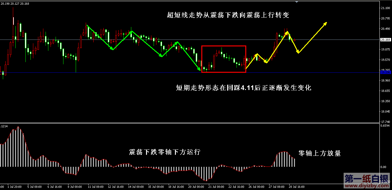 目前紙白銀價格是4.303元/克。昨日紙白銀小幅沖高回落,但這并不影響目前走勢正逐漸轉入上漲的事實,我們仍將以近期雙底4.11為底部,嘗試分批加倉多單,隨著時間推移,行情有望再度回歸新一輪上漲行情。如下圖所示為紙白銀4小時周期走勢圖,單從價格來看,銀價近期或許未出現多大漲幅,但從形態分析,紙白銀正逐漸由過去的超短線震蕩下跌行情過渡至震蕩上行走勢。圖中藍線所示為雙底4.11,該點位也是此輪行情調整的最低點,銀價曾2次大幅反彈均起于4.11,因此后市投資者需以4.11視為短線行情強弱分水嶺,亦可以該點位作為下跌過程加倉多單的基準點。圖中紅色框所示為最近一次銀價回踩4.11的情況,方框左側綠色箭頭為行情震蕩下跌走勢,其對應的動能指標大部分時間處于另中下方,暗示此時空頭力量占優;方框右側黃色箭頭為行情目前正在醞釀的震蕩上行走勢,其對應的動能指標正處于零軸上方運行,暗示此時多頭力量占優。從黃綠箭頭的轉變情況來看,銀價超短線形態正逐漸發生改變,未來看多概率依舊較大。對于昨日的沖高回落,以超短線形態來看,并不影響近期走勢繼續上漲的格局,當行情再度回踩支撐后,銀價有望繼續上行逐漸打開空間,投資者重點關注下方4.3、4.26~4.27、4.23~4.24、4.17~4.18、4.13~4.14、4.11幾線支撐,建議采取分批加倉的方式布局,而后耐心持有多單等待即可。綜合分析,紙白銀本周的美聯儲利率決議前后走勢可以視作為行情多空轉變的分水嶺,銀價日線向上突破了收縮三角形,且超短線形態正逐漸由震蕩下跌向震蕩上行轉變,后市隨著短線形態的改變,行情將有望順應大趨勢繼續拉升。目前銀價所處的格局是超短線震蕩上行,但還未帶動日線及周線的新一輪拉升,隨著時間推移,這種量變將會引起日線和周線繼續上行的質變。(注: 由于紙白銀價格是國際銀價換算而來,而換算過程中涉及到人民幣對美元匯率的變化,即使在國際銀價不變化的情況下,如果人民幣貶值或升值,也會導致紙白銀價 格出現變動。因此,我們的分析只采用最新的國際銀價對應的人民幣白銀價格,如與過去分析價格有出入, 投資者應知曉其原因。)