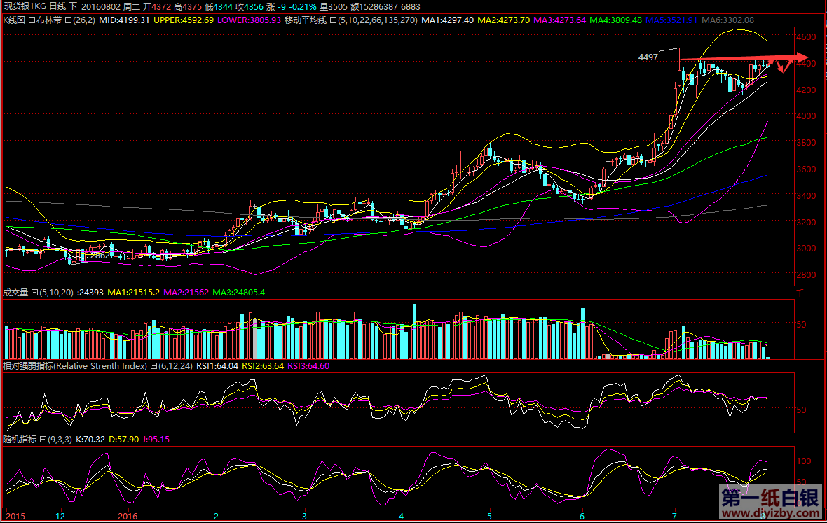 白銀價格昨日繼續走震蕩,震蕩格局比較強勢,當前價格最高已經觸及到了4.46位置,從日線級別來看,行情存在繼續走高的能力,昨日行情沒有突破該位置,日內需要再次關注該位置的破位情況. 消息面: 周一全球主要股指收跌,道指創下六連陰,美股漲跌不一,納指收漲。美油盤中跌破40美元,為四月來首次。高盛認為,歐美股市這輪上漲接近尾聲了,未來三個月可能面臨約10%的回調。高盛稱,風險偏好在轉向,而宏觀基本面沒有改善,增加了股市回調的概率。紐約聯儲主席杜德利表示,美聯儲在考慮升息問題時應該保持謹慎,因美國經濟仍面臨風險。他并表示,盡管最新的GDP數據“疲軟”,但仍預期未來18個月經濟增速將反彈至約2%。此外,據彭博,杜德利警告投資者低估了美聯儲在未來18個月里的加息次數。數據方面,美國7月ISM制造業指數52.6,不及預期,但該指數連續第五個月維持在50分水嶺上方,表明美國制造業仍很穩健。全球經濟前景不明及股市回調風險升高,許多投行買入黃金避險。據彭博社報道,掌管2300億美元資產的道明資管正在“最大限度增持”黃金。“新債王”Gundlach表示將賣空一切,但他表示將繼續持有黃金以及黃金礦商的股票。網易貴金屬首席策略師于成龍表示,由于美國GDP結果大幅不及預期,國際多家重大投資機構后市看衰美國經濟,美聯儲近期內不可能加息,經濟數據將會變得更糟糕,美元指數將下跌5%以上。可以看出,美國經濟增速從現階段而言并沒有市場預計的那么樂觀,美聯儲之所以本年度至今沒有加息的根本因素則是,美國經濟復蘇節奏走走停停令美聯儲加息態度尤為謹慎。今年下半年度,美國經濟增速變不會有實質性的改變,金銀投資仍然會是交易市場上的翹楚。截至8月1日,全球最大的黃金上市交易基金SPDR Gold Trust的黃金持倉量較前一個交易日大增5.94噸,為964.03噸,兩個交易日增加近10噸。 周二(8月2日)亞洲時段,投資者首先關注澳大利亞公布的一系列經濟數據,不過在稍后的澳洲聯儲決議公布前,數據對澳元的影響可能有限。北京時間12點30分,澳洲聯儲將會公布最新的利率決議,市場大部分分析師認為澳洲聯儲很可能降息25基點,投資者需密切關注決議聲明澳洲聯儲的表態,密切關注澳洲聯儲是否還會進一步放寬措施。除了早間澳大利亞的情況,來自中國的消息和中國市場的表現投資者也不能忽視。歐洲時段,歐元區方面,投資者需密切關注6月PPI數據,該數據可以對歐元短線走勢帶來波動。英國方面,投資者關注7月建筑業PMI,這項數據也會對英鎊短線走勢帶來指引。紐約時段,市場又迎來美國的一系列重要數據。其中核心PCE物價指數、個人收入和支出都能夠給晚間市場的情緒帶來指引。另外,交易原油的投資者不能忽視API原油庫存數據給油價走勢帶來的影響。 全球最大白銀上市交易基金(ETF)—iSharesSilverTrust統計表示,其截至8月2日止白銀持倉量為10,915.95噸,與前一交易日比增持38.42噸。 技術面: 白銀止跌反彈,收回前面大部分跌幅,漲勢有所恢復。月線上,收取上影線長的光腳中陽,收在布林帶上軌上,布林帶向上開口運行,有上行風險。周線上,收取帶上下影線的小陽,吞沒前兩周的跌幅,運行在布林上軌下方,布林帶向上開口運行,有上行風險。日線上,收得上影線長的小陽,收在中軌和上軌之間,布林帶收口后微向上運行,MACD附圖指標死叉持續縮量運行,KDJ向上運行刺穿80一線,多頭占優,有上行風險,日內操作主要以回踩做多為主,高空為輔! ![]()
