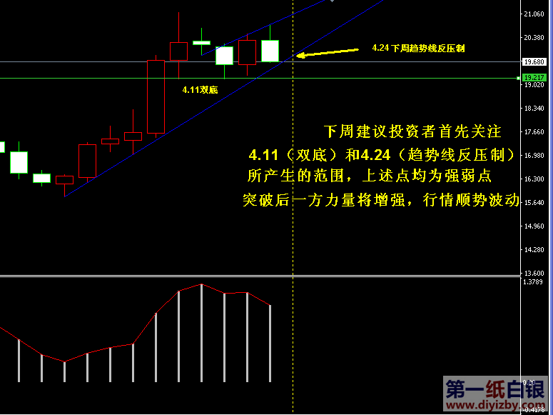 目前紙白銀價格是4.201元/克。本周紙白銀上演過山車走勢,最終運行于周線區間4.14~4.43之間。受到周五強勁非農數據的打壓,銀價發生快速回落,目前走勢有再度回踩雙底4.11的可能性,并為下周繼續調整增加了風險。如下圖所示為紙白銀周線走勢圖,由于本周銀價大跌,其收盤價格過低,圖中藍線所示的上升通道形態已經被破壞。隨著時間推移,下周銀價開盤后,將第一時間受到過去通道下沿(上升趨勢線)的反向壓制,該壓制點在4.24附近(黃色箭頭所示)。另一方面,考慮前期銀價曾兩次于4.11附近觸底反彈,該支撐具有較強的買盤力量,因此我們暫可將4.11~4.24作為下周第一波動區間,此區間內銀價偏向于先繼續下跌考驗支撐,而后能否于4.11上方企穩,則投資者需密切關注。4.11和4.24可作為下周多空力量強弱分水嶺,若銀價盤中突破4.24,則暗示非農所產生的回調行情結束,銀價有望依靠4.11雙底繼續向上緩慢運行,走勢逐漸轉強;若銀價盤中跌破4.11,則暗示空頭力量加劇破位重要支撐,后市行情將繼續向下回落調整,走勢轉弱。綜合分析,以4.11~4.24為強弱分水嶺后,下周波動區間有三種情況,第一:銀價運行于4.11~4.24之間,此時行情仍偏向于高位震蕩未破雙底,投資者可分批輕倉買入多單,但應保留足夠剩余倉位,以防未來行情突然跌破4.11后可繼續補倉;第二:銀價運行于4.24上方,此時行情屬于震蕩偏強走勢,投資者持有并適當加倉多單,等待行情突破4.52后向上打開空間即可;第三:銀價運行于4.11下方,則走勢短期內將繼續下行,但中長線仍然看漲,此種情況投資者先高拋,等待企穩后再低吸為宜。。以上建議僅供參考, 不作為下單依據。