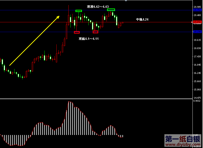 目前紙白銀價格是4.243元/克。昨日紙白銀仍維持小幅反彈,再度測試周線阻力4.24附近并未出現回落,今日行情若能完全站上該點位,則走勢有望從弱勢震蕩轉入強勢震蕩,未來投資者依舊可以雙底4.1~4.11為基礎大幅加倉多單。從當前短線形態來看,銀價正處于大區間4.1~4.43范圍內震蕩,其中4.1~4.24屬于弱勢震蕩范圍,4.24~4.43屬于強勢震蕩范圍,后市投資者應以銀價突破方向判斷行情調整是否結束。如下圖所示為紙白銀日線走勢圖,圖中藍線范圍便是當前行情震蕩區間,其中4.1~4.11為雙底支撐,4.42~4.43為雙頂壓力,可見無論是低位還是高位,銀價都具有較強的多空聚集力量,最終需考驗突破方向而判斷行情是否迎來新一輪上漲。當前銀價正處于中軌4.24附近波動,投資者可以該點位能否順利突破為參考,若日內走勢站上4.24后再發生回落,則確認突破該點位,投資者可在回落中大幅加倉多單,后市行情將有望向上考驗雙頂4.42~4.43的壓力;反之,若盤中銀價沖擊4.24附近未能成功站上便發生回落,則投資者未來需關注支撐4.1~4.11能否守穩,此時加倉多單以輕倉為主。另外,當前大趨勢仍然處于上漲格局之中(圖中黃色箭頭所示),因此在當前銀價震蕩時,投資者以順勢加倉多單更為穩健,在銀價未向下跌破震蕩區間低點4.1之前,切勿盲目做空。綜合分析,當前紙白銀正來回往返于震蕩區間,自上周行情從4.43附近沖高回落后,本周銀價出現連續反彈,若能站上4.24,則未來走勢再度考驗4.43阻力的概率將增大,屆時能否突破將關系到新一輪上漲行情是否開啟。投資者在新的上漲到來之前,需基本布局完畢多單,等待真正上漲啟動后再追多不僅點位較差,風險亦增高。因此,在確認行情突破4.24并守穩4.1底部的基礎上,開始分批大幅加倉多單為上策。(注: 由于紙白銀價格是國際銀價換算而來,而換算過程中涉及到人民幣對美元匯率的變化,即使在國際銀價不變化的情況下,如果人民幣貶值或升值,也會導致紙白銀價格出現變動。因此,我們的分析只采用最新的國際銀價對應的人民幣白銀價格,如與過去分析價格有出入, 投資者應知曉其原因。)
