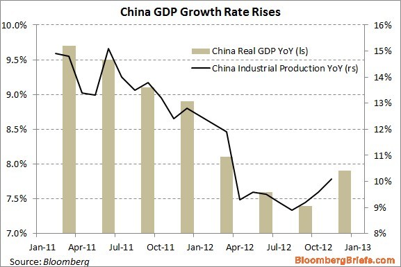 中國(guó)2012年第四季度GDP增長(zhǎng)7.9%,前值增長(zhǎng)7.4%。