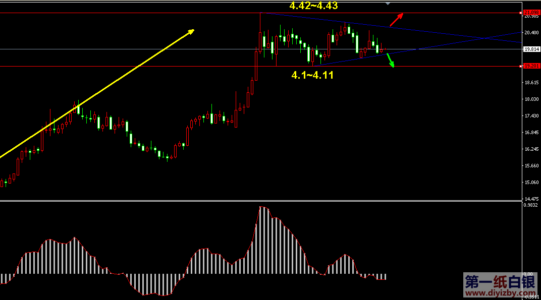 技術僅僅是基于概率論和統計學的一種綜合分析手段,絕非預測。所以技術分析是在考慮做好止損的情況下去博取大概率事件,投資不可過于迷信技術分析。(短線操作請一定做好止損,一旦被損,代表分析師基于概率和統計的技術分析不適用于當前行情) 1、紙白銀短線看點位,中線做方向。 2、以上所有價格為工商銀行買入價,即紙白銀低價。進倉點位要再加0.04,出倉則不要。 3、第一紙白銀給出的所有建議僅供投資者參考,不作為下單絕對依據,切勿過于依賴。 4、北京時間08:33發布此文章。 5、上一交易日白銀價格分析情況:(8月15日)紙白銀陷入收縮三角形 關注強弱點突破
