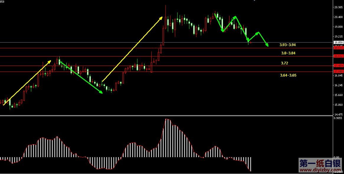 目前紙白銀價格是4.018元/克。昨日紙白銀維持窄幅波動,在銀價跌破震蕩區間4.1~4.43后,短期市場并無多大買盤力量,暗示后市行情仍有繼續向下回調的需求。近期銀價若出現短暫反彈,則是投資者嘗試高拋的良好機會,以目前的多頭力量來看,行情并不具備立即企穩的條件,預計稍作反彈后仍將繼續向下回踩。如下圖所示為紙白銀日線走勢圖,如圖中黃色箭頭所示為銀價主趨勢上漲浪,綠色箭頭所示為銀價次級趨勢回調浪,目前走勢正處于以次級回調趨勢為主的行情中,當綠色箭頭遭遇黃色箭頭所形成的大支撐后,銀價方有望改變次級調整重新進入主升浪之中。我們用紅線繪出了下方幾線重要的支撐位分別是3.93~3.94、3.8~3.84、3.72、3.64~3.65,上述點位是未來銀價獲得重大買盤力量的支撐位,也是行情可能出現止跌企穩的點位,在銀價未觸及上述支撐之前,投資者仍以先高拋的思路為主,等待回踩支撐后,可先關注其反彈力度是否發生變化,若見明顯的快速拉升或轉入橫盤整理跡象,則可嘗試順應主趨勢反手做多的思路。綜合分析,從昨日行情的反彈力度來看,銀價大跌后空頭也未出現回補情況,顯示短期內走勢仍將繼續向下回踩支撐,而后在支撐位方有望重新獲得買盤力量。日內投資者若首先關注行情是否反彈,若見反彈可繼續加倉空單,第一目標看至3.93~3.94附近。在未來銀價回踩下圖支撐后,投資者立即離場空單,而后保持觀望,等待企穩后方可開始做多。大趨勢以黃色箭頭上漲為主,短期趨勢以綠色箭頭下跌為主,當短期趨勢遇到大趨勢支撐后,可能發生趨勢改變。(注: 由于紙白銀價格是國際銀價換算而來,而換算過程中涉及到人民幣對美元匯率的變化,即使在國際銀價不變化的情況下,如果人民幣貶值或升值,也會導致紙白銀價 格出現變動。因此,我們的分析只采用最新的國際銀價對應的人民幣白銀價格,如與過去分析價格有出入, 投資者應知曉其原因。)