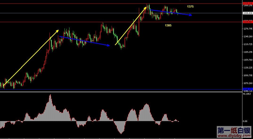 基本面方面:昨日市場消息面較為清淡,日內并無較多經濟數據公布,周一美國方面唯一公布的數據顯示,美國7月芝加哥聯儲全國活動指數0.27,預期0.2,該數據仍然表現良好,繼續利空貴金屬。目前市場焦點已經轉向周五美聯儲主席耶倫的講話,預計此次講話或稱為主導金銀下一步方向的重要推動因素,在講話之前由于市場情緒較為謹慎,行情可能按照固有趨勢發生波動。由于周日時段,美聯儲副主席費希爾的言論推升美國年底前加息的押注,他在周日講話時暗示2016年加息仍在考慮之中,稱美國經濟已經接近達到該央行的目標。今日美國經濟數據較多,投資者可關注晚間21:45公布的美國8月Markit制造業PMI初值、22:00公布的美國8月里奇蒙德聯儲制造業指數、美國7月新屋銷售總數年化。 提醒:近期黃金走勢仍然強于白銀,雖然銀價向下跌破了震蕩區間,但黃金價格卻依舊維持于大區間內震蕩,未來金價的區間突破方向可作為下一步銀價調整或企穩的參考標準。如下圖所示為黃金價格日線走勢圖,當前金價正處于大區間1305~1375范圍內波動,后市行情若向下跌破1305,則銀價調整空間或將擴大,此時并不可急于抄底做多,仍以高拋為主,觀望為輔的思路對待;若后市銀價向上突破1375,則銀價較大概率企穩后跟隨金價恢復漲勢,此時可嘗試低位增加倉位做多?梢哉f由于黃金和白銀具有趨勢的趨同性,當二者走勢不一時,黃金的任何較大的變動,都可作為銀價波動的參考。