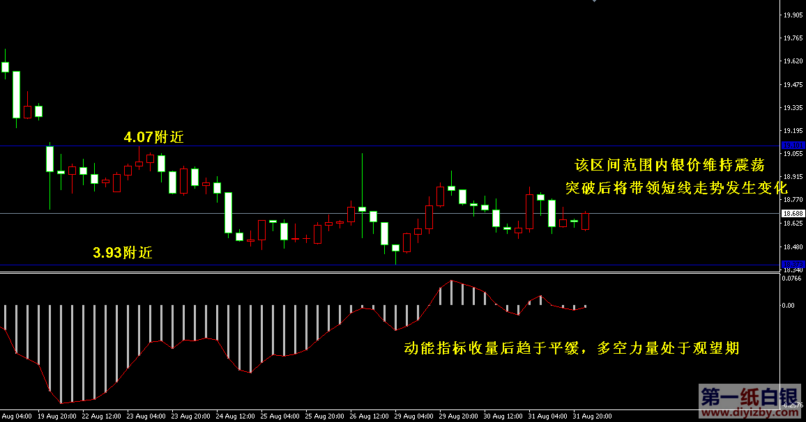 技術僅僅是基于概率論和統計學的一種綜合分析手段,絕非預測。所以技術分析是在考慮做好止損的情況下去博取大概率事件,投資不可過于迷信技術分析。(短線操作請一定做好止損,一旦被損,代表分析師基于概率和統計的技術分析不適用于當前行情) 1、紙白銀短線看點位,中線做方向。 2、以上所有價格為工商銀行買入價,即紙白銀低價。進倉點位要再加0.04,出倉則不要。 3、第一紙白銀給出的所有建議僅供投資者參考,不作為下單絕對依據,切勿過于依賴。 4、北京時間08:55發布此文章。 5、上一交易日白銀價格分析情況:(8月31日)紙白銀多空交投謹慎,窄幅震蕩中醞釀突破