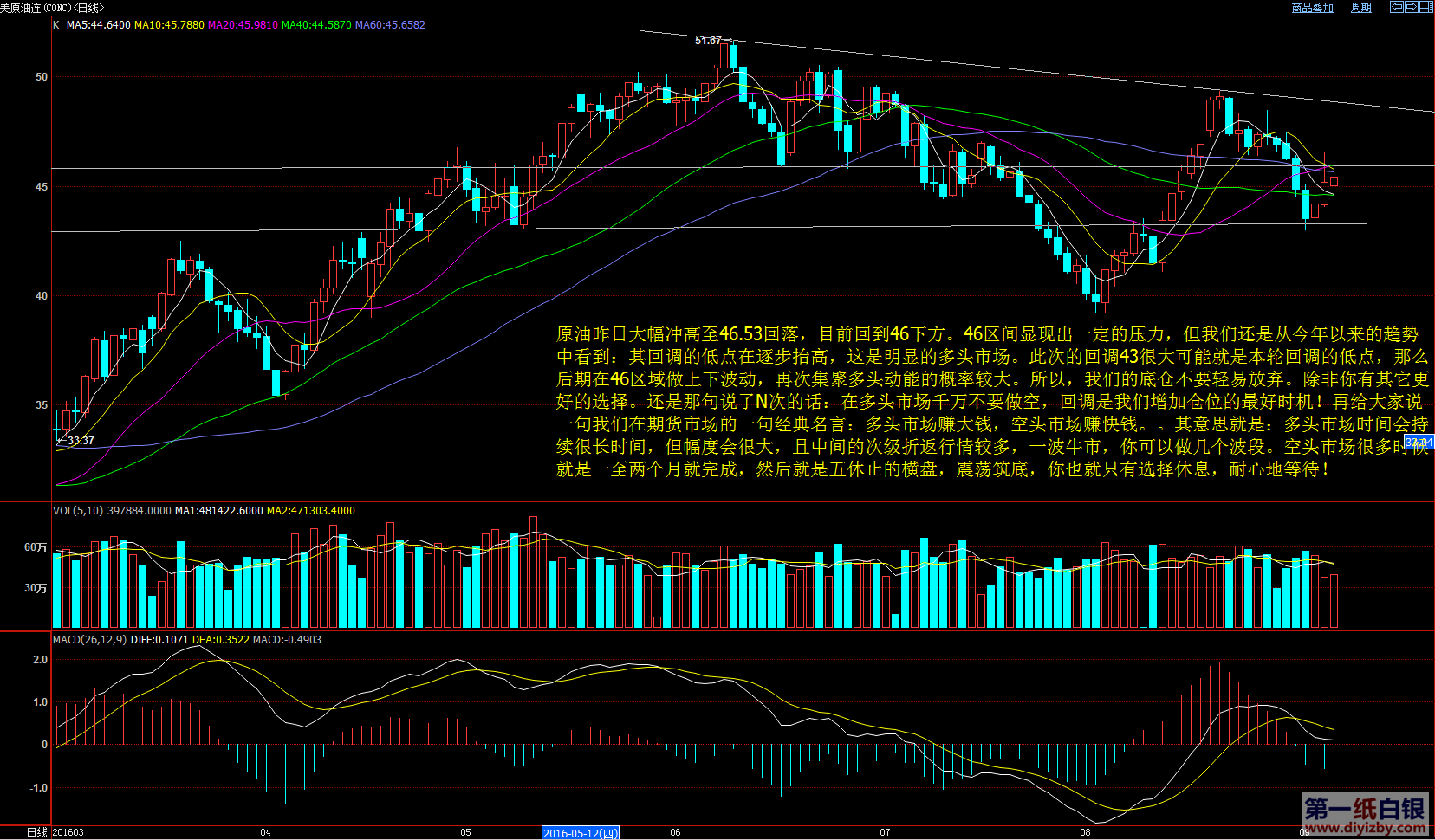 白銀價格目前已經連續(xù)三個交易日站穩(wěn)60日均線上方,并突破短線下跌趨勢線阻力,多頭已經占據明顯的優(yōu)勢,下一個目標就是沖擊中期下跌趨勢線阻力20.30區(qū)域,目前建議投資者繼續(xù)持有多單,不要輕易做空。 如下圖所示,目前銀價除了站穩(wěn)60日均線以外,已經對收縮三角形上沿有所突破,接下來考驗的是來自于前期高點連接而成的趨勢線壓制,其延伸段預計在20.3附近。 日內建議可以回踩60日均線19.3~19.4附近加倉多單。 再 來看看原油走勢,昨日原油價格大幅沖高至46.33后回落,目前回到46下方。46區(qū)間顯現出一定的壓力,但我們還是從今年以來的趨勢中看到:其回調的低 點正逐漸抬高,這是明顯的多頭市場。此次回調43很大可能就是本輪回調的低點,那么后期在46區(qū)域做上下波動,再次聚集多頭動能的概率較大。 所以,我們的底倉多單不應輕易放棄,堅定持有即可。在多頭市場中千萬不要做空,回調則是我們加倉多單的良好時機。
