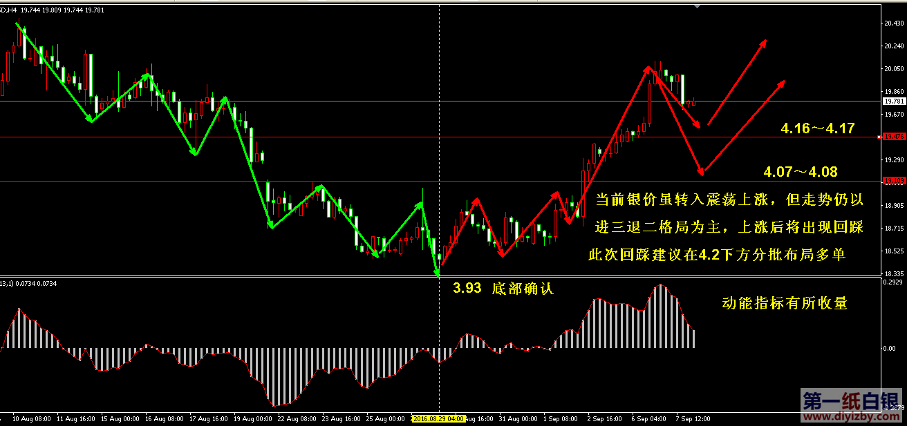 目前紙白銀價格是4.219元/克。昨日紙白銀走出沖高回落走勢,正如我們所說,當銀價觸及4.27上方后,行情將面臨較為密集的阻力帶壓制,隨著短線多頭動能減弱,空頭力量有所增強,銀價難免再度出現一輪回踩。歸根結底,當前走勢在擺脫了4.07強弱分水嶺后,仍然處于大區間3.93~4.39的范圍內震蕩,其中4.27~4.39具有較為密集的阻力帶,受此壓制而出現一輪回踩行情,后市銀價恐暫時維持在區間3.93~4.39范圍內震蕩,此過程中,行情將出現回踩支撐的情況,投資者可在回踩過程中分批布局多單,等待未來走勢突破4.39后,銀價將完成短線“震蕩--上漲”的蛻變。如下圖所示為紙白銀4小時周期走勢圖,我們以圖中黃色虛線為分割點,左側綠色箭頭所示為銀價過去的震蕩下跌走勢,右側紅色箭頭所示為銀價的震蕩緩慢上行走勢,可見此輪銀價回落并非再度下跌行情,而是緩慢上行走勢中的一輪回調浪,其回調空間預計有限,再度回踩支撐后,行情有望重新開啟反彈,投資者在短線回踩中不應盲目做空,而應等待其回踩支撐后重新接入多單,再度上漲后將有望獲利。當前銀價正以進三退二的方式震蕩緩慢上行,建議投資者日內可在行情回落至4.2下方后開始嘗試分批加倉多單,此時風險和利潤均較合理,其中需關注支撐4.16~4.17、4.13(周線支撐)、4.07~4.08(過去強弱分水嶺)幾線。值得注意的是,圖中紅色箭頭仍然處于綠色箭頭的包含范圍之內,因此行情還未走出單邊上漲格局,仍然處于空頭包圍之中,此時上漲預計較為緩慢,在布局完畢多單后,投資者仍需更多的耐心持倉等待和觀望。綜合分析,銀價早前突破強弱分水嶺4.07后便已經確認了3.93的底部事實,后市投資者可圍繞該點位不破嘗試分批加倉多單,但由于前期下跌浪較為持久,此時銀價還未完全突破前浪高點,因此銀價仍然處于下跌浪包含范圍內,走勢屬于震蕩緩升狀態。銀價處于區間3.93~4.39范圍內恐維持一段時間震蕩,此時投資者盡量靠近較低點位布局多單,而后觸及阻力后獲利離場,盤中多保持觀望思路,切勿盲目追漲殺跌或做空。(注: 由于紙白銀價格是國際銀價換算而來,而換算過程中涉及到人民幣對美元匯率的變化,即使在國際銀價不變化的情況下,如果人民幣貶值或升值,也會導致紙白銀價 格出現變動。因此,我們的分析只采用最新的國際銀價對應的人民幣白銀價格,如與過去分析價格有出入, 投資者應知曉其原因。)