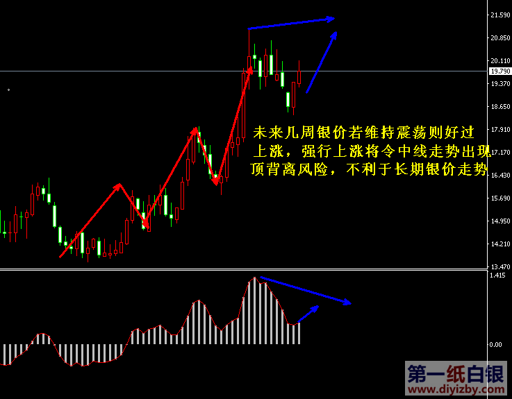 基本面方面:昨日晚間美國幾項經濟數據表現良好,且美聯儲官員繼續發布了升息言論,這打壓了貴金屬市場的避險情緒。具體數據顯示,美國7月JOLTS職位空缺587.1萬,打破4月份所創紀錄最高位,預期563萬,前值564.3萬。另外,舊金山聯儲主席威廉姆斯威廉姆斯近期表示,他仍然支持加息宜早不宜遲,重申了他在疲軟的8月非農就業數據公布之前的言論。不過,今日凌晨美聯儲公布了較為鴿派的褐皮書報告,其中褐皮書報告顯示美國經濟溫和增長支撐了市場對于聯儲短期內不會升息的觀點,褐皮書指出,多數地區報告薪資壓力仍相當溫和,預計未來數月將保持此狀況;另外,四年多來,通脹一直低于聯儲2%的目標,在看到通脹持續上升前,決策者仍對升息感到猶豫。由此可見,目前美聯儲內部仍然對盡快升息產生擔憂,預計9月美聯儲難以實現加息。今日市場焦點轉移至歐洲央行利率決議,投資者也擔憂近來疲弱的美國數據會增加歐洲央行進一步放寬政策的壓力,由此可能會刺激全球新一輪貨幣寬松浪潮,對于貴金屬未來仍然有極大的利多可能性。投資者還需關注晚間20:30公布的美國9月3日當周初請失業金人數、23:00公布的美國9月2日當周EIA原油庫存變動。 提醒:從周線形態來看,未來幾周銀價并不具備強行快速上漲的條件,因前期下跌動能指標快速放量,此時市場中線買盤力量仍不充足,還需時間積累,若強行拉升,恐破壞中線上漲形態,最終難免出現周線頂背離風險。如下圖所示為紙白銀周線走勢圖,圖中藍色箭頭為假設銀價未來幾周快速上漲所產生的形態,當前行情因剛剛經歷了大調整,不宜快速反彈,否則可能應買盤動能不足而過渡消耗能量,最終在突破前高后形成頂背離風險。未來幾周銀價若維持震蕩走勢,則好過與快速上漲,震蕩中實際是積累長期多頭的過程,過快上漲將透支已經存在的買盤力量,不利于下半年銀價表現。因此,若果真近期行情維持震蕩波動,則投資者應具備更多的耐心持倉等待,激進者在回落震蕩中可通過不斷的低吸后反彈獲利來進行短線操作。