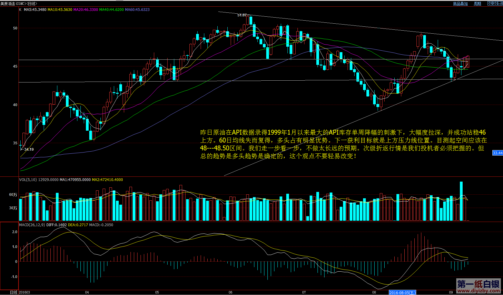 昨日白銀價格如期在阻力位20關(guān)口上方出現(xiàn)回落,目前建議投資者繼續(xù)持有多單,空倉者可再次介入。目前銀價仍處于60日均線上方運(yùn)行,60日均線位于19.35~19.4附近,在該點(diǎn)位上方則可堅(jiān)定持有多單。 日內(nèi)策略:繼續(xù)逢低加倉多單,止損19.3下方,目標(biāo)看20上方。 再來看看原油走勢,昨日原油在API數(shù)據(jù)錄得1999年1月以來最大的API庫存單周降幅刺激下,大幅度拉升,并成功站上46美元上方。60日均線失而復(fù)得,多頭占優(yōu)明顯優(yōu)勢。下一獲利目標(biāo)就是圖中上方壓力線位置,其阻力預(yù)計(jì)在48~48.5附近,建議投資者持倉等待目標(biāo)位后盈利,不做長遠(yuǎn)預(yù)期。 當(dāng)前油價和銀價同樣運(yùn)行于次級折返行情中,這是投資者把握做多的良機(jī),總體趨勢以上漲為主,做多思路不能輕易改變。