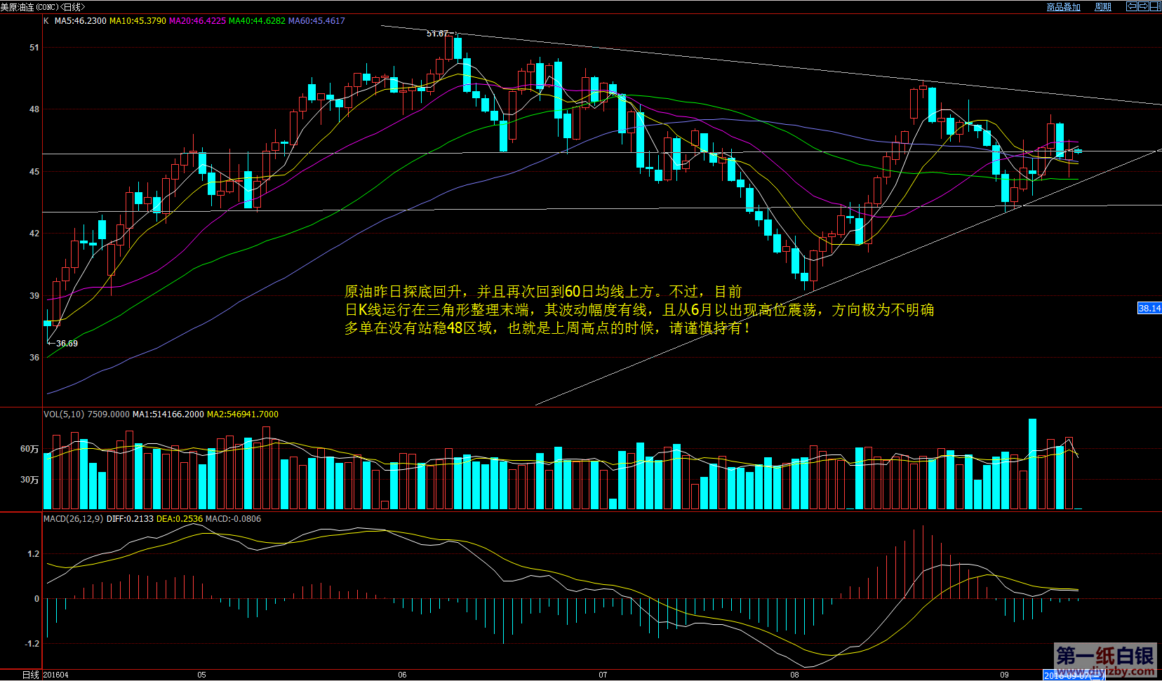 昨日白銀價格以T字十字星收盤,而最低觸及的正是下圖所示的三角形支撐線位置,今日白銀價格如果能夠再以中陽線收盤,最好沖擊19.5~19.5附近,則 將確認多頭力量復蘇,那么可以繼續持有多單,后市有望開啟新一輪上漲;反之,今日如果銀價以小陰線收盤,那么走勢在觸底反彈后多頭力量不足,后市需謹防繼 續回落,多單需做好止損。 如下圖所示當前銀價處于小三角形范圍內波動,昨日雖然回踩了支撐反彈,但目前并未突破三角形阻力,日內關注收盤情況,今日強勢則后市強勢,今日弱勢則需謹防回調繼續。 日內策略,暫時持有多單觀望。 再來看看原油走勢,昨日原油探底回升,并且再次回到了60日均線上方。不過,目前原油的日K線運行在三角形末端,其波動幅度預計有限,且從6月以來行情連續出現高位震蕩,方向極為不明確。多單在沒有站穩48區域之前應該謹慎持有。
