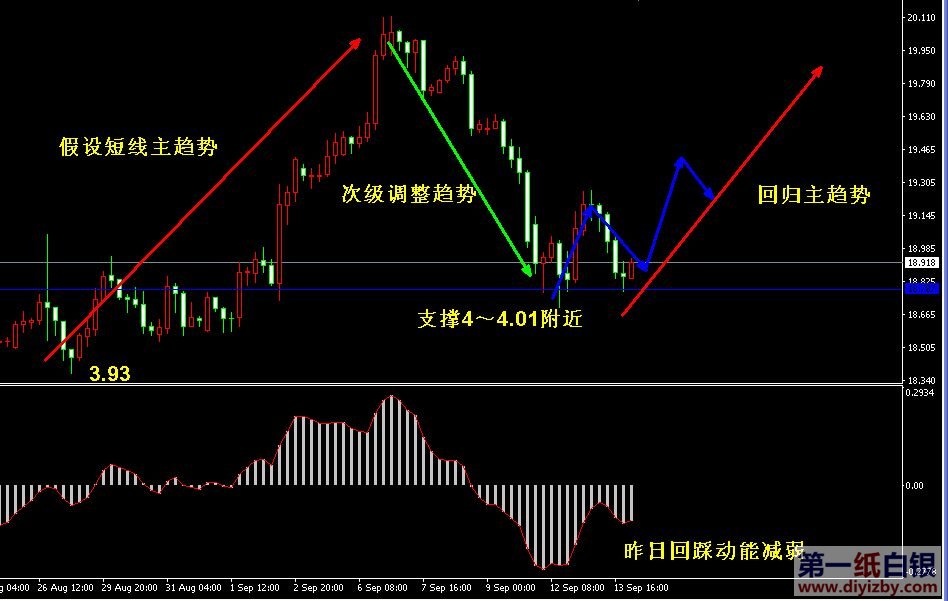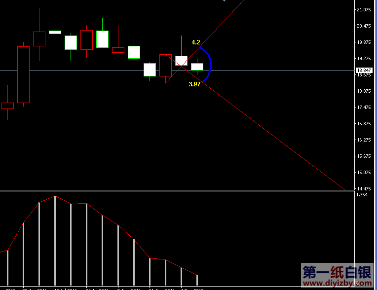 目前紙白銀價格是4.049元/克。昨日紙白銀走出回踩行情,最終在支撐位4.01~4.02停止下跌,這與我們給出的回落加倉點位一致。不過,伴隨昨日行情回落后,日線并未形成“早晨之星”形態(tài),今日投資者將在持有多單的前提下,關注銀價反彈力度,若能收盤并突破昨日高點,則將確認本周低點4.01附近的事實;反之,若不能形成有效反彈,投資者還需繼續(xù)耐心等待,后市我們可將昨日高點4.12視為短線強弱分水嶺。如下圖所示為紙白銀4小時周期走勢圖,我們可以假設3.93中線支撐為近期回調(diào)低點,則過去一輪以3.93為起點的上漲則為“假設短線主趨勢”行情,那么最近一輪的下跌回調(diào)則為“假設次級調(diào)整趨勢”,當本周初銀價回踩4~4.01時,此時銀價實際上觸及到“假設主趨勢”的支撐位(4.01與3.97為強支撐),從道氏理論來看,當次級回調(diào)趨勢觸及主趨勢支撐后,有望順應主趨勢發(fā)生變化。隨著近期銀價在4.01支撐附近形成較大反彈,我們可假設銀價正改變回調(diào)走勢,向著主趨勢上漲發(fā)展。當然,上述推測我們給出假設二字,證明事實還未發(fā)生,后市我們將以昨日反彈高點4.12作為信號確認點和強弱分水嶺,銀價在突破4.12后將完成圖中藍色箭頭所示的震蕩上行的初步形態(tài),由此開啟順應紅色箭頭的上漲趨勢。今日激進者仍可圍繞3.97、4.01兩線支撐位嘗試分批加倉多單,穩(wěn)健者在持有少量多單后保持觀望,等待突破4.12確認短線企穩(wěn)反轉(zhuǎn)信號后,可開始增加倉位。當然,上述趨勢為短線走勢,其上漲形態(tài)將有望沖擊大區(qū)間阻力帶4.27~4.39,屆時因大趨勢震蕩的影響,不排除行情繼續(xù)陷入?yún)^(qū)間波動的可能,但短線投資者可逐漸圍繞低點抬高的事實不斷加倉,后市在突破4.39區(qū)間高點后,有望開啟新一輪拉升。綜合分析,目前紙白銀正在大區(qū)間內(nèi)震蕩來回波動,因此,近期回踩支撐4.01或3.97后銀價有望掉頭向上波動,這是我們嘗試在低位做多的第一個理由;另外,近期銀價觸及支撐后形成了較大的反彈力度,不過昨日行情再度回踩支撐,暗示銀價未走入強勢拉升格局,仍然處于震蕩緩慢上行之中,這是我們低位做多的第二個理由。近期銀價只要確認找底部3.93不被跌破,則銀價將繼續(xù)在區(qū)間3.93~4.39范圍內(nèi)震蕩,隨著下方空間縮小,后市行情將逐漸向上波動的概率較大。(注: 由于紙白銀價格是國際銀價換算而來,而換算過程中涉及到人民幣對美元匯率的變化,即使在國際銀價不變化的情況下,如果人民幣貶值或升值,也會導致紙白銀價 格出現(xiàn)變動。因此,我們的分析只采用最新的國際銀價對應的人民幣白銀價格,如與過去分析價格有出入, 投資者應知曉其原因。)