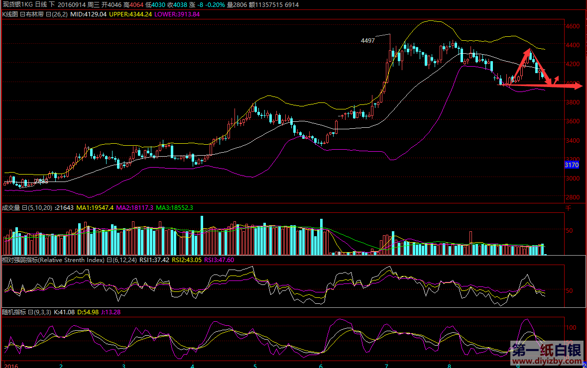 周二(9月13日)白銀走了連續(xù)性回撤,再次回落至周一低點(diǎn)位置且收盤于低點(diǎn),日線形成陰線,在今日的行情當(dāng)中需要特別注意的是行情經(jīng)歷了沖高回落收低,那么在一定程度上會有所向下延續(xù),也就是說今日的銀幣有望繼續(xù)回落,凌晨連續(xù)性橫盤,按照4小時級別當(dāng)中,上方關(guān)注4.12-4.15一線阻力,關(guān)鍵性位置處于昨日午盤的高點(diǎn)位置,下發(fā)關(guān)注4.02一線支撐,今日繼續(xù)看下行。 消息面: 周一美聯(lián)儲理事布雷納德發(fā)表了偏鴿派的講話后黃金跌勢有所緩解,但金價仍繼續(xù)下跌。有“美聯(lián)儲通訊社”之稱的華爾街日報首席經(jīng)濟(jì)記者Jon Hilsenrath日前也撰文稱,美聯(lián)儲并未就9月加息達(dá)成強(qiáng)烈共識,傾向于等到年底再加息。從6月末英國公投之后,黃金就開始了漫長的整理,圖形顯示1302-1358黃金寬幅的區(qū)間震蕩,而市場焦點(diǎn)仍然是美聯(lián)儲加息預(yù)期,以及其他主要央行行動方向。英國央行(BoE)將于周四(9月15日)發(fā)布利率決議;日本央行將于9月21日公布最新的利率決議。在這些重大決定發(fā)布之前,市場觀望氣氛濃重,不過有機(jī)構(gòu)仍認(rèn)為支撐黃金上漲的基本面不變,金價下一步還將繼續(xù)上行,目前不過是尋底階段。 周三(9月14日)亞洲時段,投資者稍加留意澳大利亞的經(jīng)濟(jì)數(shù)據(jù),關(guān)注日本的工業(yè)產(chǎn)出數(shù)據(jù),當(dāng)然重點(diǎn)還是要關(guān)注中國市場的走向。歐洲時段,歐元區(qū)方面,投資者先是留意法國的CPI數(shù)據(jù),然后重點(diǎn)關(guān)注歐元區(qū)的工業(yè)產(chǎn)出數(shù)據(jù),預(yù)計該數(shù)據(jù)會指引歐元短線走勢的方向。英國方面,投資者重點(diǎn)關(guān)注英國失業(yè)率數(shù)據(jù),在周二英國公布的不及預(yù)期的通脹數(shù)據(jù)重挫英鎊之后,英國的就業(yè)數(shù)據(jù)是否也會不及預(yù)期呢?投資者拭目以待。另外,時段內(nèi)中國還會公布實(shí)際外商投資數(shù)據(jù),投資者也要密切關(guān)注。紐約時段,美國數(shù)據(jù)方面,投資者主要關(guān)注美國的進(jìn)口物價指數(shù)。 全球最大白銀上市交易基金(ETF)—iSharesSilverTrust統(tǒng)計表示,其截至9月14日止白銀持倉量為11,272.98噸,與前一交易日比增持41.34噸。 技術(shù)面: 日線上,收得一根帶下影線長的小陰,收在布林帶中軌下方,布林帶上中軌向下運(yùn)行,下軌走平運(yùn)行,MACD附圖指標(biāo)形成死叉運(yùn)行,KDJ向下運(yùn)行,接觸20一線,預(yù)計有回踩需求,從K線走勢高點(diǎn)低點(diǎn)不斷下移,仍然偏弱,有下行風(fēng)險。4小時上,承壓布林帶中軌下方,布林帶向下運(yùn)行,MACD附圖指標(biāo)死叉運(yùn)行,KDJ向下運(yùn)行接觸20一線,有下行風(fēng)險,操作上暫時以反彈做空為主,低多為輔!