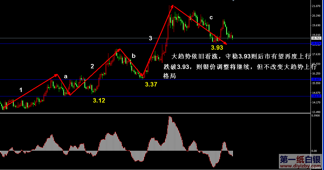目前紙白銀價格是4.014元/克。本周紙白銀基本維持弱勢震蕩,周初銀價沖高4.12后開始回落,直至周五行情始終未能突破該點位,因此也確認了4.12為近期銀價是否再度轉入上漲的強弱分水嶺。后市投資者可暫時先關注小區間3.93~4.12之間,當銀價運行于該區間時,走勢處于弱勢整理格局,此時由于行情處于大震蕩區間3.93~4.39的低位支撐帶附近,因此投資者可輕倉布局少量多單,而后關注小區間3.93~4.12的突破。若銀價后市向上突破4.12,則走勢將轉強,行情有望繼續向著大區間阻力帶4.27~4.39范圍內波動;反之,若銀價向下跌破3.93大震蕩區間低點,則走勢轉弱,行情將重新向下打開空間。如下圖所示為紙白銀日線走勢圖,如圖中紅色箭頭所示,以大趨勢來看,當前銀價仍然處于上漲格局之中,但目前短線行情以C浪回落為主,近期銀價若能守穩3.93,則再度反彈后有望開啟新一輪上漲4浪;反之,若跌破3.93,則銀價將繼續延續C浪調整,但只要不跌破3浪起點3.37,則并不改變大趨勢上行格局,只是延長調整時間和空間。因此,后市投資者可先以小區間3.93~4.12來決定銀價強弱轉換,而后再結合大趨勢判斷走勢是否轉入新的上漲或繼續調整,配合大小趨勢變化進行相應的操作更為合理。綜合分析,盡管本周銀價始終維持弱勢震蕩走勢,但并未走出實際有意義的突破,建議下周投資者繼續持有輕倉多單后保持觀望,等待上述小區間3.93~4.12突破后可順勢跟進。下周四將迎來美聯儲利率決議,市場關于此次決議的加息預期并不高,若美聯儲9月不能加息,短期內銀價仍有繼續上漲的可能性;反之,美聯儲9月意外加息,則銀價或將大跌。下周市場重點圍繞美聯儲決議而波動,預計決議前市場仍保持謹慎觀望態勢。以上建議僅供參考, 不作為下單依據。