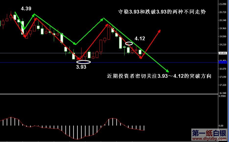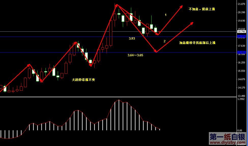目前紙白銀價格是4.017元/克。上周五紙白銀出現較大幅度下跌,不過當前走勢仍然處于小區間內弱勢震蕩,后市銀價突破3.93~4.12后,行情將作出第一步方向選擇,其中3.93為大震蕩區間低點和中長線支撐位,跌破此處暗示銀價向下打開空間且將繼續進行深度調整;4.12為上周行情反彈高點,也是短線銀價的強弱分水嶺,突破此處后走勢將轉入強勢,銀價將在區間3.93~4.39內向著上方阻力帶4.27~4.39靠攏。如下圖所示為紙白銀日線走勢圖,我們分別用綠色箭頭和紅色箭頭假設了未來可能發生的兩種走勢,其均以圍繞3.93支撐為關鍵分水嶺,綠色箭頭顯示銀價若跌破3.93后將延續從4.39高位震蕩回落的走勢格局,向下打開較大空間,屆時投資者在行情跌破3.93后應嘗試首先高拋為主,反彈可分批加倉做空,直至銀價再度企穩后可重新判斷新的方向;紅色箭頭顯示銀價若突破4.12和4.39后將完成日線變形的頭肩底形態,屆時走勢有望依靠此頭肩底形態再度開啟一輪新的漲勢,投資者可在突破4.12和4.39后分別加倉多單,新的上漲行情將與中長線上漲趨勢統一方向,具有較大的利潤空間。綜合分析,本周四即將迎來重磅消息--美聯儲利率決議,在決議之前預計銀價仍難以選擇方向,但決議后行情將走出明確的走勢,屆時投資者一方面要順應消息面多空下單,另一方面也參考下圖可能形成的走勢形態進行布局。近幾日銀價若始終維持在區間3.93~4.12范圍內波動,則投資者僅可持有少量多單保持觀望(該小區間屬于大區間3.93~4.39的支撐帶范圍,不宜做空)。(注: 由于紙白銀價格是國際銀價換算而來,而換算過程中涉及到人民幣對美元匯率的變化,即使在國際銀價不變化的情況下,如果人民幣貶值或升值,也會導致紙白銀價 格出現變動。因此,我們的分析只采用最新的國際銀價對應的人民幣白銀價格,如與過去分析價格有出入, 投資者應知曉其原因。)
