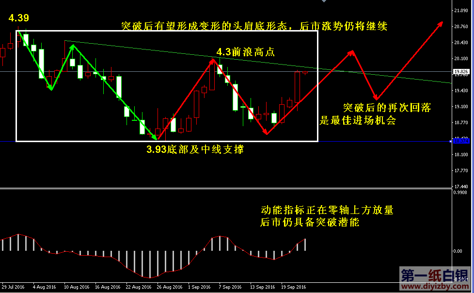 目前紙白銀價格是4.237元/克。昨日紙白銀大幅上漲,受到日本央行推行貨幣寬松政策,以及預(yù)期美聯(lián)儲9月不加息的影響,銀價盤中多次沖擊強(qiáng)弱分水嶺4.12,最終實現(xiàn)突破,在美聯(lián)儲利率決議前,銀價便已大幅上漲。今日凌晨公布的美聯(lián)儲利率決議未能加息,雖暗示年內(nèi)可能加息一次,但因調(diào)低了未來經(jīng)濟(jì)預(yù)期展望,市場對于年內(nèi)加息仍存疑慮。紙白銀當(dāng)前已經(jīng)完成了第一步,突破強(qiáng)弱分水嶺4.12,接下來將逐漸向著大震蕩區(qū)間阻力帶4.27~4.39范圍內(nèi)靠攏,投資者可重點關(guān)注前期高點4.3的突破,突破此處后日線亦將形成2浪上漲形態(tài),且完成頭肩底的構(gòu)造。如下圖所示為紙白銀日線走勢圖,以圖中紅綠箭頭所組成的走勢正在構(gòu)造新的日線頭肩底形態(tài),后市投資者可關(guān)注前浪高點4.3的突破,銀價完成該點位突破后將同時形成頭肩底形態(tài)及紅色箭頭所示的二浪上漲結(jié)構(gòu),屆時將證明日線在長期調(diào)整之后重新回歸震蕩上行步伐。亦如圖中綠色箭頭所示,銀價上漲過程將一步步靠近阻力,且突破后亦將考驗4.27~4.39的密集阻力帶,屆時預(yù)計行情仍有進(jìn)一步回踩的需求,投資者可在行情實現(xiàn)突破4.3后的第一次回落開始布局多單,此時便是2浪回踩行情,屆時將是最佳的進(jìn)場布局機(jī)會,再次小幅回踩后銀價沖擊4.39大震蕩區(qū)間高點有望完全突破,此處突破后中線走勢將開啟新一輪拉升。近期動能指標(biāo)MACD顯示銀價買盤動能仍處于放量之中,暗示行情沖擊第一道阻力線及前浪高點4.3具備突破的潛能,由于當(dāng)前點位較差,不建議投資者在4.2上方追多,在突破4.3之前,投資者仍可等待回落4.2下方分批加倉,或等待突破4.3后回落分批進(jìn)場。綜合分析,正如我們昨日所說,技術(shù)面若實現(xiàn)突破,則消息面影響并不大,昨日銀價首先突破4.12強(qiáng)弱分水嶺,由此已將走勢帶入強(qiáng)勢區(qū)域。銀價已經(jīng)完成了由弱勢震蕩轉(zhuǎn)入強(qiáng)勢震蕩的變化,接下來將逐漸考驗大區(qū)間3.93~4.39的阻力帶壓制,建議投資者可首先關(guān)注4.3前浪高點突破,其次關(guān)注震蕩區(qū)間高點4.39的突破。(注: 由于紙白銀價格是國際銀價換算而來,而換算過程中涉及到人民幣對美元匯率的變化,即使在國際銀價不變化的情況下,如果人民幣貶值或升值,也會導(dǎo)致紙白銀價 格出現(xiàn)變動。因此,我們的分析只采用最新的國際銀價對應(yīng)的人民幣白銀價格,如與過去分析價格有出入, 投資者應(yīng)知曉其原因。)