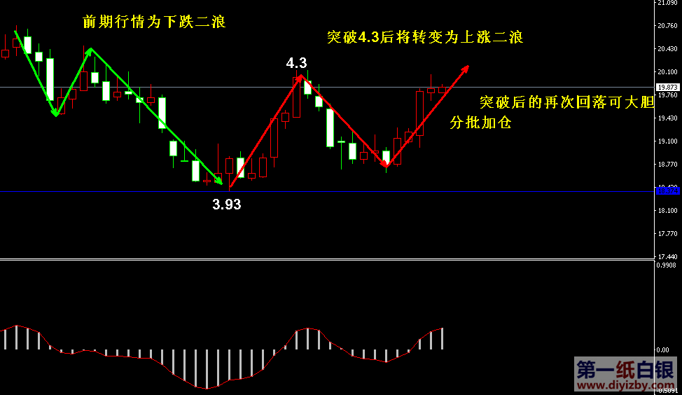 目前紙白銀價格是4.241元/克。昨日紙白銀繼續上行,自銀價突破強弱分水嶺4.12后,走勢轉入強勢格局,預計后市銀價仍將繼續向上測試阻力,建議投資者可繼續持有多單保持觀望。日內可首先關注日線前浪高點4.3,此處未突破之前,仍然建議投資者在4.2下方分批做多,若盤中銀價突破4.3,則由于確認了上漲二浪的走勢形態,投資者可直接采取分批3~4分的方式加倉多單。如下圖所示為紙白銀日線走勢圖,我們以綠色箭頭和紅色箭頭區分近期行情的不同走勢,銀價自4.39開始連續下跌,直至3.93后發生企穩反彈,但截至目前為止,一方面走勢并未完全突破4.39以來的下跌包圍,另一方面,也未形成自有的上漲形態,因此保守者仍需持有多單在4.2下方分批布局多單,不可追多。假若后市銀價向上突破4.3,則銀價將形成獨立的上漲形態,雖暫未突破4.39大震蕩區間高點,但走勢再次回落便可視為上漲二浪的回踩行情,屆時投資者方可大膽嘗試分批3~4分加倉多單,并忽略具體進場點位。雖然銀價目前的阻力帶位于4.27~4.39之間,但投資者僅關注4.3和4.39的突破即可,每當其破位一道阻力位,多頭力量將被確認強化,投資者便可增加倉位進場布局。綜合分析,值得投資者注意的是,銀價處于大區間3.93~4.39范圍內運行時,整體走勢仍然屬于震蕩行情(二浪下跌+二浪上漲),直至突破4.39后,銀價將完成“震蕩--上漲”的轉變,屆時中線趨勢亦將與短線趨勢完成方向統一,開展新一輪拉升。目前大震蕩區間的阻力帶位于4.27~4.39之間,若遲遲不能突破4.3,則投資者需耐心等待4.2下方分批加倉;盤中銀價若沖破4.3,雖可能繼續產生回踩,但屆時由于趨勢轉強,投資者可直接在回落中分批3~4分加倉多。由于大趨勢看漲,建議投資者在震蕩區間內以回落分批加倉多單為主,切勿盲目做空。(注: 由于紙白銀價格是國際銀價換算而來,而換算過程中涉及到人民幣對美元匯率的變化,即使在國際銀價不變化的情況下,如果人民幣貶值或升值,也會導致紙白銀價 格出現變動。因此,我們的分析只采用最新的國際銀價對應的人民幣白銀價格,如與過去分析價格有出入, 投資者應知曉其原因。)
