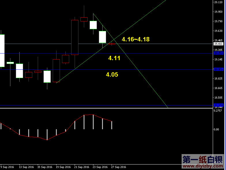 技術僅僅是基于概率論和統計學的一種綜合分析手段,絕非預測。所以技術分析是在考慮做好止損的情況下去博取大概率事件,投資不可過于迷信技術分析。(短線操作請一定做好止損,一旦被損,代表分析師基于概率和統計的技術分析不適用于當前行情) 1、紙白銀短線看點位,中線做方向。 2、以上所有價格為工商銀行買入價,即紙白銀低價。進倉點位要再加0.04,出倉則不要。 3、第一紙白銀給出的所有建議僅供投資者參考,不作為下單絕對依據,切勿過于依賴。 4、北京時間08:55發布此文章。 5、上一交易日白銀價格分析情況:(9月26日)紙白銀考驗關鍵阻力,突破將形成上漲形態
