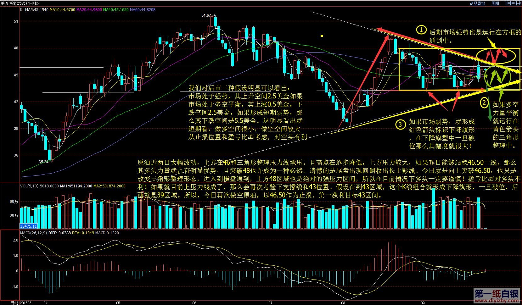白銀價格經歷了兩個交易日的回調后,昨日一度站上60日均線19.7一線,但最終未能收盤在19.7上方,如果收盤在19.7區域,則意味著此次回調結束,然而收盤不佳則說明行情仍然繼續調整。不過,我們從K線形態上看,圖中方框區域對其支撐非常強勁,只要在該區域上方運行,后市應該以多頭思路對待。雖然上方受到壓力線壓制,但紅色柱總是多于綠色柱,且紅色實體大于綠色實體,顯示市場多頭力量較空頭強勁。介于目前總體市場還是處于區間震蕩之中,投資者仍然保持多看少動的思路。 日內策略:持有前期19.5及下方多單者可持有觀望。 再來看看原油走勢:原油近兩日大幅波動,上方在46美元和三角形整理壓力線承壓,且高點在逐步降低,上方壓力較大。如果昨日能夠站穩46.5一線,則多頭力量占據明顯優勢,且突破48成為可能。但最終收盤出現長上影線,今日即使向上突破46.5,其也只是改變三角形整理形態,進入到盤整通道,上方48區域仍是絕對壓力區域。 目前原油多頭仍然需要謹慎,如果無法突破壓力線,則后市或繼續考驗支撐線43附近。假設在43區域,這個K線組合將形成下降旗形,一旦破位,后市看至39附近。 策略:今日再次做空原油,以46.5為止損,第一獲利看43區域。