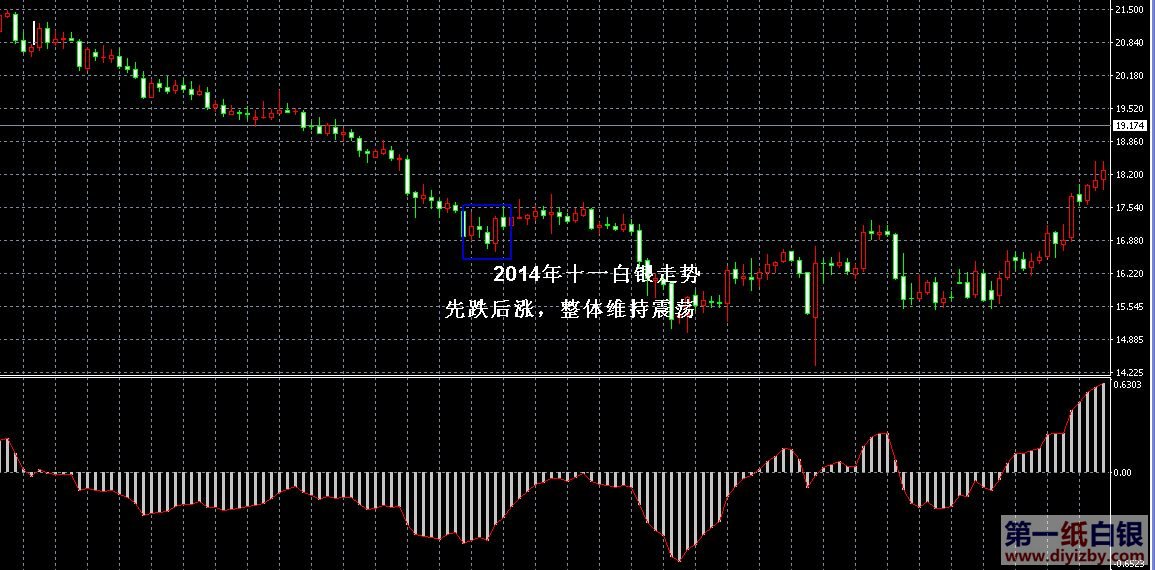 2013年十一期間白銀走勢:此時(shí)白銀價(jià)格仍然處于熊市階段,且短線亦處于下跌格局之中,不過十一假期期間,銀價(jià)迎來了反彈修正,觸底反彈后幅度超過2美金,整體走勢維持上漲,而后過了十一假期才延續(xù)跌勢。