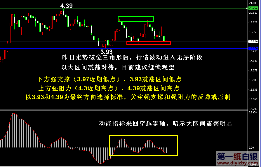 目前紙白銀價(jià)格是4.023元/克。昨日紙白銀大幅收陰,周初銀價(jià)便跌破了收縮三角形下沿,雖未能說明走勢已經(jīng)轉(zhuǎn)跌,但疲軟的多頭力量暗示行情仍然處于弱勢。接下來投資者將繼續(xù)關(guān)注大區(qū)間3.93、3.97、4.3、4.39四大關(guān)鍵點(diǎn)位,其中3.93和4.39為震蕩區(qū)間低點(diǎn)和高點(diǎn),突破后將決定銀價(jià)接下來短線走勢方向,而3.97和4.3分別為近期行情回踩和反彈的低點(diǎn)和高點(diǎn),具備一定買盤和賣盤力量,此處投資者需關(guān)注銀價(jià)的反彈和回落力度。如下圖所示為紙白銀日線走勢圖,由于銀價(jià)跌破收縮三角形的緣故,我們再次回歸到用震蕩區(qū)間判斷走勢方向的格局。不得不承認(rèn),近期的多頭力量較為疲軟,投資者應(yīng)更加謹(jǐn)慎的加倉多單,僅僅持有部分多單保持觀望,嚴(yán)格止損3.93區(qū)間低點(diǎn)下方。圖中紅色框和綠色框分別為近期銀價(jià)回落的低點(diǎn)支撐位3.97和高點(diǎn)阻力位4.3,昨日走勢在回踩了3.97附近后又再度停止下跌,今日建議投資者首先關(guān)注此處反彈,若跌破后則關(guān)注3.93震蕩區(qū)間能否守穩(wěn),依次跌破上述點(diǎn)位后,說明行情將進(jìn)一步下跌調(diào)整,屆時(shí)操作思路轉(zhuǎn)變?yōu)橄雀邟仦橹,等待企穩(wěn)后再嘗試低吸;反之,若銀價(jià)守住3.93區(qū)間低點(diǎn),并能在3.97附近形成較大反彈,則依舊以區(qū)間震蕩行情對待,下一次走勢反彈遇阻后減倉多單離場,直至最終區(qū)間突破后可大幅加倉。另外,近期日線動(dòng)能指標(biāo)正來回穿越零軸附近,也充分說明了行情處于震蕩走勢之中,在銀價(jià)未跌破3.93之前,投資者亦不可盲目做空。綜合分析,昨日的下跌暗示市場多頭力量疲軟,今日考驗(yàn)支撐后能否守穩(wěn)十分關(guān)鍵,一旦跌破3.93,則說明走勢為期3個(gè)月的震蕩調(diào)整結(jié)束,震蕩后行情仍將繼續(xù)下跌回踩支撐,屆時(shí)銀價(jià)或?qū)⒅饾u測試中線支撐3.65附近,此種情況下建議投資者在跌破3.93后先反彈高拋,等待企穩(wěn)后方可低吸;日內(nèi)銀價(jià)若能頂住壓力守穩(wěn)3.93,則投資者亦須關(guān)注其反彈力度,由于多頭疲軟缺乏買盤支撐,建議投資者輕倉持有多單即可。(注: 由于紙白銀價(jià)格是國際銀價(jià)換算而來,而換算過程中涉及到人民幣對美元匯率的變化,即使在國際銀價(jià)不變化的情況下,如果人民幣貶值或升值,也會(huì)導(dǎo)致紙白銀價(jià) 格出現(xiàn)變動(dòng)。因此,我們的分析只采用最新的國際銀價(jià)對應(yīng)的人民幣白銀價(jià)格,如與過去分析價(jià)格有出入, 投資者應(yīng)知曉其原因。)