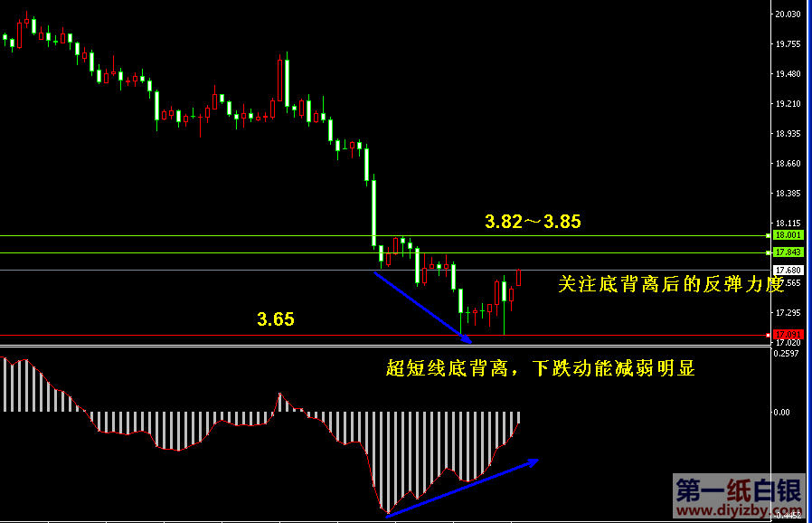 基本面方面:上周初雖一系列美國經濟數據表現強勁,且美聯儲官員連番釋放鷹派言論,增加了投資者對于12月其加息的預期,但周五疲軟的非農數據令市場再度心灰意冷,目前關于美聯儲12月加息預期不足50%,這也成為支撐上周五銀價反彈的重要因素。具體數據顯示,美國9月新增非農就業15.6萬人,預期17.2萬人,前值15.1萬;9月失業率5%,預期4.9%,前值4.9%。由于此前美聯儲主席耶倫強調,2016年底前雖有一次加息,但仍將參考美國經濟復蘇狀況而定,言外之意將以美國經濟好壞均定是否加息。而連續兩個月疲軟的非農數據,可能成為阻礙美聯儲加息的重要障礙,建議投資者本周重點關注周四凌晨公布的美聯儲9月會議紀要以及周五的耶倫講話。今日市場消息較為清淡,建議投資者關注下午16點公布的中國M2貨幣供應年率,晚間美國應哥倫布日休市,無重要數據公布。 提醒:從超短線形態來看,銀價亦出現一定的下跌動能減弱跡象。如下圖所示為紙白銀4小時周期走勢圖,伴隨上周五銀價快速探底,超短線行情在3.65附近出現了底背離形態,暗示短期內支撐銀價繼續下跌的空頭力量已經大幅減弱,伴隨該點位的買盤支撐,銀價有望迎來持續反彈。投資者應關注圖中綠線所示的3.82~3.85的小阻力帶,在下跌動能減弱,和多頭力量增強的背景下,銀價能否首先突破3.82~3.85的第一阻力帶將關系到后市行情是否守穩3.65的可能性。