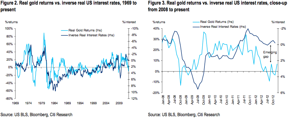 與此同時,金價與實際利率的負相關性似乎開始打破過去幾年一直持續的狀態,分化現象顯現(點擊圖片查看大圖):