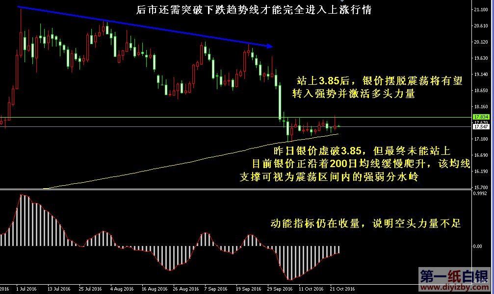 技術(shù)僅僅是基于概率論和統(tǒng)計學(xué)的一種綜合分析手段,絕非預(yù)測。所以技術(shù)分析是在考慮做好止損的情況下去博取大概率事件,投資不可過于迷信技術(shù)分析。(短線操作請一定做好止損,一旦被損,代表分析師基于概率和統(tǒng)計的技術(shù)分析不適用于當(dāng)前行情) 1、紙白銀短線看點(diǎn)位,中線做方向。 2、以上所有價格為工商銀行買入價,即紙白銀低價。進(jìn)倉點(diǎn)位要再加0.04,出倉則不要。 3、第一紙白銀給出的所有建議僅供投資者參考,不作為下單絕對依據(jù),切勿過于依賴。 4、北京時間08:57發(fā)布此文章。 5、上一交易日白銀價格分析情況:(10月24日)紙白銀持續(xù)震蕩 靜待突破區(qū)間后選擇方向