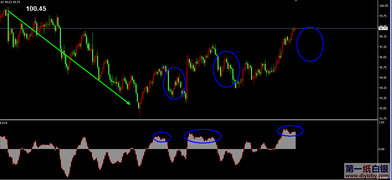基本面方面:昨日市場消息較為清淡,不過公布的美國經(jīng)濟(jì)數(shù)據(jù)仍然支撐美聯(lián)儲升息,數(shù)據(jù)顯示,美國10月Markit制造業(yè)PMI初值53.2,為2015年10月來最高;預(yù)期51.5,前值51.5。另外,昨日圣路易斯聯(lián)儲主席布拉德重申了支持美聯(lián)儲年內(nèi)加息的觀點(diǎn),其表示:通脹率將升至2%,失業(yè)率接近目標(biāo),年內(nèi)需要一次加息;芝加哥聯(lián)儲主席埃文斯周一發(fā)表言論指出,短期增長前景相對良好,希望美聯(lián)儲加息,以便在未來衰退時有降息空間。眾多美聯(lián)儲官員的升息言論正籠罩市場,令昨日貴金屬走出了沖高回落的走勢。今日數(shù)據(jù)較多,建議投資者可重點(diǎn)關(guān)注晚間21:00公布的美國8月房價相關(guān)指數(shù)、22:00美國10月諮商會消費(fèi)者信心指數(shù)、美國10月里奇蒙德聯(lián)儲制造業(yè)指數(shù)、23:30歐洲央行行長德拉基發(fā)表關(guān)于貨幣政策的講話。 提醒:由于銀價波動較窄,我們繼續(xù)對美元進(jìn)行分析。如下圖所示為美元指數(shù)日線走勢圖,綠色箭頭代表了主趨勢下跌行情,目前美指處于次級反彈趨勢之中,不過也面臨了一定的回落風(fēng)險。圖中藍(lán)色圈所示分別為美指反彈過程中遭遇的回落,其所對應(yīng)的動能指標(biāo)均有頂背離形態(tài)的發(fā)生,每當(dāng)伴隨動能指標(biāo)出現(xiàn)頂背離形態(tài)后(價格創(chuàng)出新高,但買盤動能未能創(chuàng)出新高),則后市美指都出現(xiàn)一輪較大回落。此次,同樣的情況再次發(fā)生,美指動能指標(biāo)又出現(xiàn)了頂背離形態(tài),在連續(xù)3周上漲后,多頭消耗過度,后市我們將重點(diǎn)關(guān)注其是否產(chǎn)生一輪回調(diào)行情,若如此,無疑將對金銀走勢產(chǎn)生極大利多。