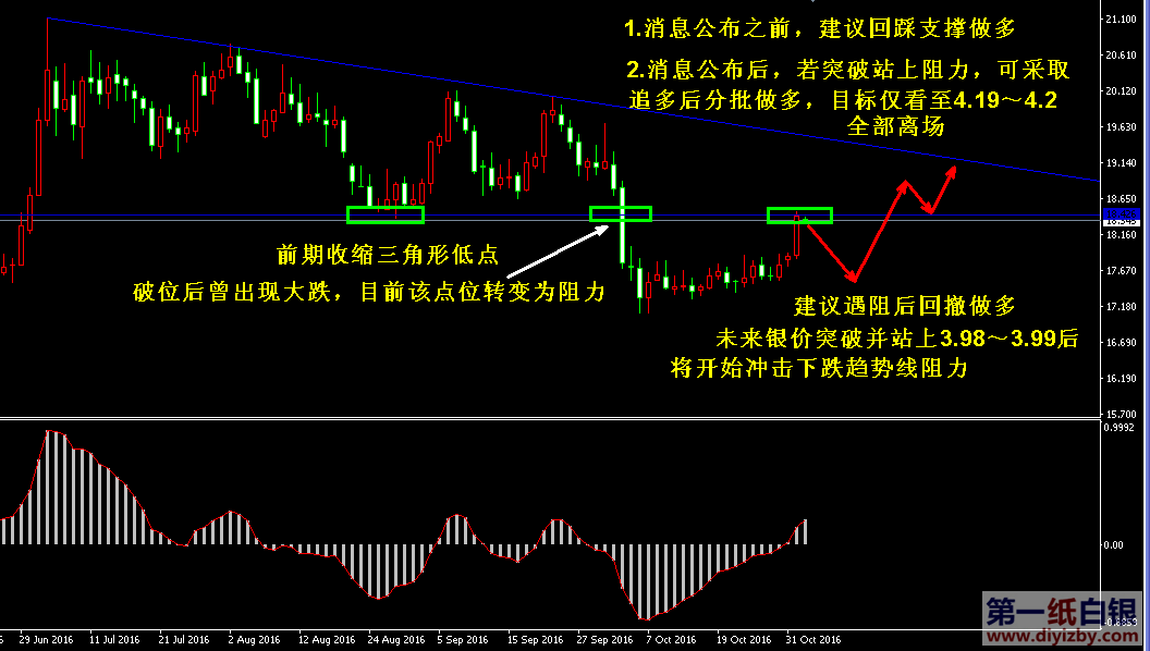 目前紙白銀價格是3.975元/克。昨日紙白銀大幅上漲,正如我們所預測,銀價在突破3.87震蕩區間高點后,將沖擊第二阻力3.98附近,昨日行情最高漲至4元,略微突破阻力,雖未能成功站上,但已經完成了我們前期多頭的一輪獲利了結。目前行情正處于阻力位附近徘徊,且晚間將迎來極為重要的美聯儲利率決議,日內需耐心等待行情回落后方可做多,或等待美聯儲決議公布后擇機判斷。如下圖所示為紙白銀日線走勢圖,我們用藍線圈定了銀價在7月~9月維持的收縮三角形形態,當10月初行情跌破收縮三角形低點支撐后,引發了一輪空頭行情,可見其下跌關鍵導火索位于圖中綠色框所示支撐處,當銀價跌破此處后,目前該點位已經轉化為阻力。昨日行情反彈至該點位附近停止上漲,雖還未能出現回落,但此處便是我們所說的銀價上漲中的第二阻力位,當前行情正處于該阻力附近波動,建議投資者切勿追多。如圖中紅色箭頭所示,近期銀價若能出現一輪回踩行情,不僅僅是確認多頭企穩的機會,更是投資者二次進場加倉的良好時機。其后等待走勢突破并站上3.98~3.99后,銀價將有望開始沖擊圖中三角形上沿所示的下跌趨勢線阻力,這便是我們所說的第三阻力位,也是代表著中線行情是否產生新一輪上漲的關鍵分水嶺。綜合分析,目前銀價反彈的結果正是行情前3周努力震蕩蓄力的成果,在其突破3.87第一阻力后行情便完成了多頭強化,后市若能回踩支撐守穩低點3.67不破,將徹底確認3.67的底部事實,繼而銀價有望開始順應中長線上漲趨勢反攻,隨著其突破下跌趨勢線阻力(藍色斜線),銀價將結束來自于7月開始的一輪中級回調行情?梢灶A見,近期的回調不僅僅是布局短線多單的時機,更是回落加倉中長線多單的最佳機會和點位,建議行情近期回落后投資者應密切關注。(注: 由于紙白銀價格是國際銀價換算而來,而換算過程中涉及到人民幣對美元匯率的變化,即使在國際銀價不變化的情況下,如果人民幣貶值或升值,也會導致紙白銀價 格出現變動。因此,我們的分析只采用最新的國際銀價對應的人民幣白銀價格,如與過去分析價格有出入, 投資者應知曉其原因。)