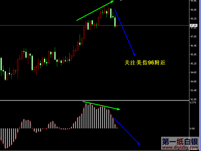 基本面方面:昨日市場公布的一系列美國經濟數據表現良好,具體數據顯示,美國10月Markit制造業PMI終值53.4,創2015年10月以來新高,預期53.2,初值53.2;美國10月ISM制造業指數51.9,預期51.7,前值51.5;上述數據雖表現好于預期,但并未刺激投資者繼續買入美元資產,在臨近美國總統大選之際,由于希拉里爆發的“郵件門”事件發酵,投資者對于特朗普的支持率大幅上升,令市場避險情緒重新回歸,支撐貴金屬強勢反彈。原油方面因API原油庫存大增且市場懷疑OPEC減產計劃而繼續打壓油價下行。今日晚間即明日凌晨2點,美聯儲將公布11月最新利率決議,目前市場普遍預計美聯儲在本周會議中將維持利率不變,但可能釋放12月加息的種種預期,這或成為日內對金銀施壓的關鍵因素。據最新的民調顯示,市場預計12月升息的可能性為74%,本周升息的可能性只有7%,因此晚間投資者需關注的重點是美聯儲決議的內容,而非結果,從中捕捉12月加息預期走向,將影響貴金屬短期波動方向。今日投資者應關注晚間20.15公布的美國10月ADP就業人數、22:30公布的美國10月28日當周EIA原油庫存數據、重點關注凌晨2點美國11月聯邦基金利率決議。 提醒:除了成功預測金銀走勢筑底上漲以外,近期我們建議投資者多多關注的美元指數也完全符合我們的預測。如下圖所示為美元指數日線走勢圖,昨日美指延續大跌,這是前期我們強調下跌后的連續第三日回落行情。正如圖中綠色箭頭所示,當前美元指數遭遇了日線級別的頂背離形態,其次因面臨中長線阻力98.5附近的壓制,多頭開始減弱,空頭增強,令美元出現沖高回落行情。后市隨著圖中藍色所示的動能指標繼續下行放量,預計美元指數將朝著96附近的第一支撐靠攏。美元的繼續下行,將為金銀價格的反彈帶來較大的支撐。