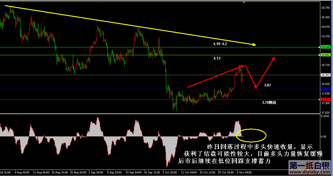 2、以上所有價(jià)格為工商銀行買入價(jià),即紙白銀低價(jià)。進(jìn)倉點(diǎn)位要再加0.04,出倉則不要。 3、第一紙白銀給出的所有建議僅供投資者參考,不作為下單絕對(duì)依據(jù),切勿過于依賴。 4、北京時(shí)間08:59發(fā)布此文章。 5、上一交易日白銀價(jià)格分析情況:(11月3日)紙白銀鞏固強(qiáng)勢(shì),后市有望沖擊趨勢(shì)線阻力