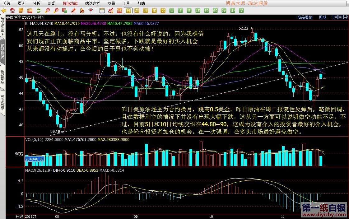 白銀價格上周的斷崖式下跌,擊碎了投資者看多的心態,再次擔心銀價進入熊市的可能性。不過目前從K線組合形態來看,銀價的強支撐位置在16.3附近,但從黃金分割線的0.618來看,其支撐在16.48附近,因此后市投資者可以重點關注16.3~16.48區域的支撐。 目前銀價趨勢仍然明確的看漲,只是此輪中級回調較為猛烈,后市我們依舊堅定持有多單,但要做倉位的調節,高拋低吸可以降低短線持倉均價。 白銀策略:近期短線單可放棄,當行情回落到上述支撐區域才可做中線多單,其余情況暫時持倉觀望。 再來看看原油走勢,昨日原油調高。0.5美金,出現報復性反彈行情,油價在數據利空的情況下并沒有出現大幅下跌,這從另一方面可以說明做空的動能不足。不過,目前5日和10日均線交織在44.8~44.9附近,這成為沒有介入投資者買入多單的最好機會,也是輕倉投資者加倉的機會。 值得投資者注意的是,目前原油在超跌后出現了日線底背離形態,此次連續幾日反彈也是因底背離超跌的緣故,后市預計仍有反彈幅度,投資者在多頭市場暫時避免做空。 原油策略:若能回落至44.8~44.9可以加倉多單。