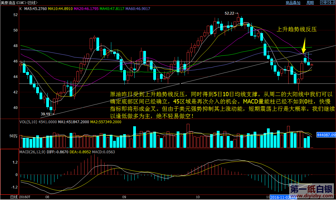昨日白銀價格再次跌至黃金分割線的16.5附近,目前對于白銀應(yīng)該最擔(dān)心的是美聯(lián)儲加息對市場帶來的不確定性。美聯(lián)儲加息目前到現(xiàn)在已經(jīng)2年多了,市場一直為之波動,任何風(fēng)險來自于不確定性,但兩年時間已經(jīng)讓市場有足夠的準(zhǔn)備來迎接此事件而產(chǎn)生的影響,加之關(guān)于美聯(lián)儲加息的預(yù)期已經(jīng)消化的七七八八,后市行情繼續(xù)依靠該消息下跌的空間著實(shí)不大。 目前銀價來到了黃金分割的16.5附近,我仍然相信此處是很安全的做多區(qū)域,下方空間不大。 策略:白銀可繼續(xù)在16.5做多,保守投資者觀望。 再來看看原油走勢,昨日原油受到上升趨勢線反向壓制回落,不過受到5日均線和10日均線支撐企穩(wěn)。從周二的大陽線中我們可以確定底部區(qū)域已經(jīng)確立,45附近是再次介入多單的機(jī)會。 目前原油MACD量能柱已經(jīng)步入到0軸附近,快慢指標(biāo)即將形成金叉,但由于美元強(qiáng)勢抑制其上漲動能,短期震蕩上行是大概率事件,建議原油投資者繼續(xù)做多,絕不輕易做空。 策略:原油可在45繼續(xù)介入多單。