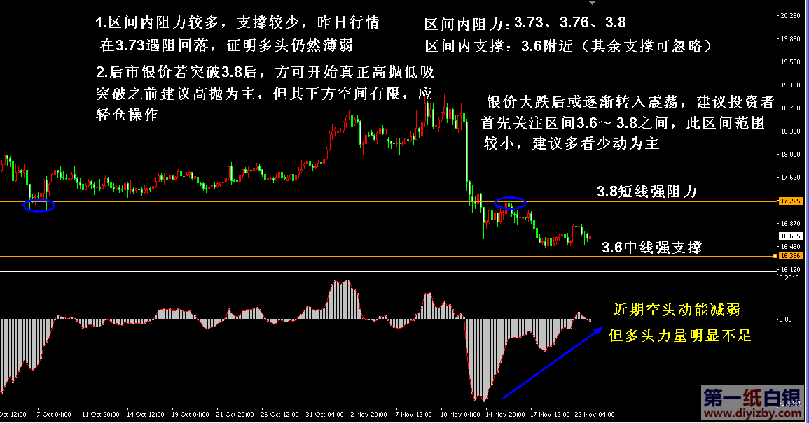 第一紙白銀預計今日市場多:空:震蕩概率為3:3:4。 技術僅僅是基于概率論和統計學的一種綜合分析手段,絕非預測。所以技術分析是在考慮做好止損的情況下去博取大概率事件,投資不可過于迷信技術分析。(短線操作請一定做好止損,一旦被損,代表分析師基于概率和統計的技術分析不適用于當前行情) 1、紙白銀短線看點位,中線做方向。 2、以上所有價格為工商銀行買入價,即紙白銀低價。進倉點位要再加0.04,出倉則不要。 3、第一紙白銀給出的所有建議僅供投資者參考,不作為下單絕對依據,切勿過于依賴。 4、北京時間09:11發布此文章。 5、上一交易日白銀價格分析情況:(11月22日)白銀走勢逐漸轉入震蕩 決議后或完成筑底